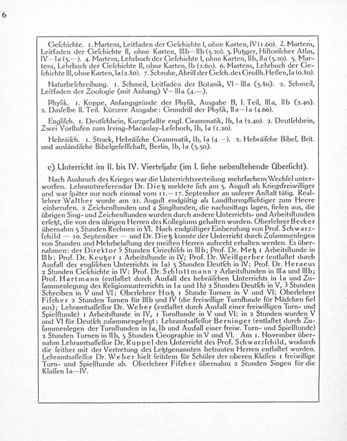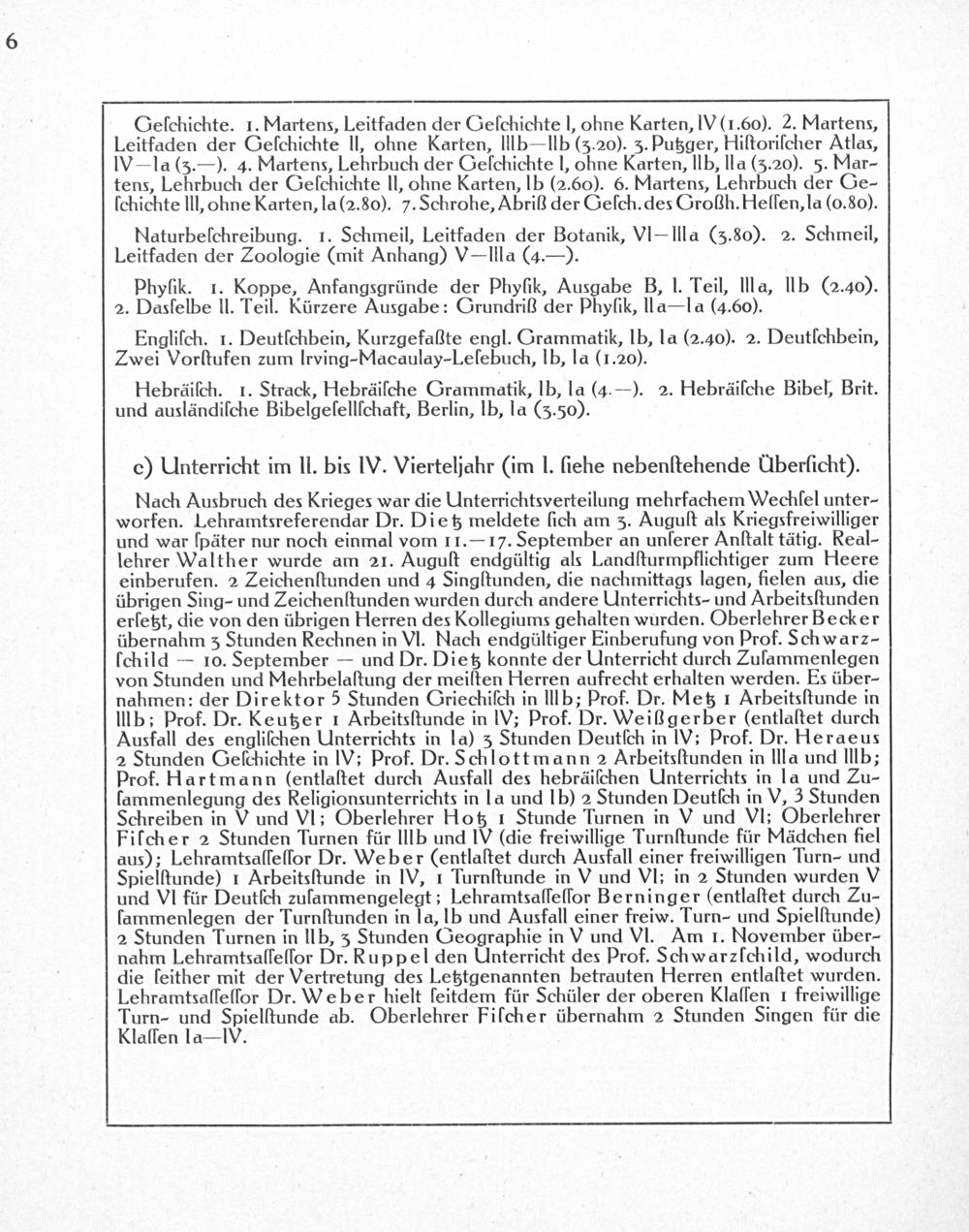 MNach Ausbruch des Krieges war die Unterrichtsverteilung mehrfachem Wechſel unter- worfen. Lehramtsreferendar Dr. Dietz meldete ſich am 5. Auguſt als Kriegsfreiwilliger und war ſpäter nur noch einmal vom I1.—17. Septemnber an unferer Anſtalt tätig. Real- lehrer Walther wurde am 21. Auguſt endgültig als Landſturmpflichtiger zum Heere einberufen. 2 Zeichenſtunden und 4 Singſtunden, die nachmittags lagen, fielen aus, die übrigen Sing- und Zeichenſtunden wurden durch andere Unterrichts- und Arbeitsſtunden erſeßt, die von den übrigen Herren des Kollegiums gehalten wurden. Oberlehrer Becker übernahm 3 Stunden Rechnen in VI. MNach endgültiger Einberufung von Prof. Schwarz- ſchild— 10. September— und Dr. Dietz konnte der Unterricht durch Zuſammenlegen von Stunden und Mehrbelaſtung der meiſten Herren aufrecht erhalten werden. Es über- nahmen: der Direktor 5 Stunden Griechiſch in lllb; Prof. Dr. Metz 1 Arbeitsſtunde in Ib; Prof. Dr. Keutzer 1 Arbeitsſtunde in IV; Prof. Dr. Weißgerber(entlaſtet durch Ausfall des engliſchen Unterrichts in la) 3 Stunden Deutſch in IV; Prof. Dr. Heraeus 2 Stunden Geſchichte in IV; Prof. Dr. Schlottmann 2 Arbeitsſtunden in llla und lllb; Prof. Hartmann(entlaſtet durch Ausfall des hebräiſchen Unterrichts in la und Zu- ſammenlegung des Religionsunterrichts in la und 1b) 2 Stunden Deutſch in V, 3 Stunden Schreiben in Vund VI; Oberlehrer Hotz 1 Stunde Turnen in V und VI; Oberlehrer Fifcher 2 Stunden Turnen für llib und IV(die freiwillige Turnſtunde für Mädchen fiel aus); Lehramtsaſſeſlor Dr. Weber(entlaſtet durch Ausfall einer freiwilligen Turn- und Spieiſtunde) 1 Arbeitsſtunde in IV, 1 Turnſtunde in V und VI; in 2 Stunden wurden V und VI für Deutſch zuſammengelegt; Lehramtsaſſfeſſor Berninger(entlaſtet durch Zu- ſammenlegen der Turnſtunden in la, lIb und Ausfall einer freiw. Turn- und Spielſtunde) 2 Stunden Turnen in llb, 3 Stunden Geographie in V und VI. Am 1. November über- nahm Lehrarmntsaſſeſſor Dr. Ruppel den Unterricht des Prof. Schwarzſchild, wodurch die ſeither mit der Vertretung des Letztgenannten betrauten Herren entlaſtet wurden. Lehramtsaſfeſſor Dr. Weber hielt ſeitdem für Schüler der oberen Klaſſen 1 freiwillige Nunf⸗ die F elWhele ab. Oberlehrer Filcher übernahm 2 Stunden Singen für die