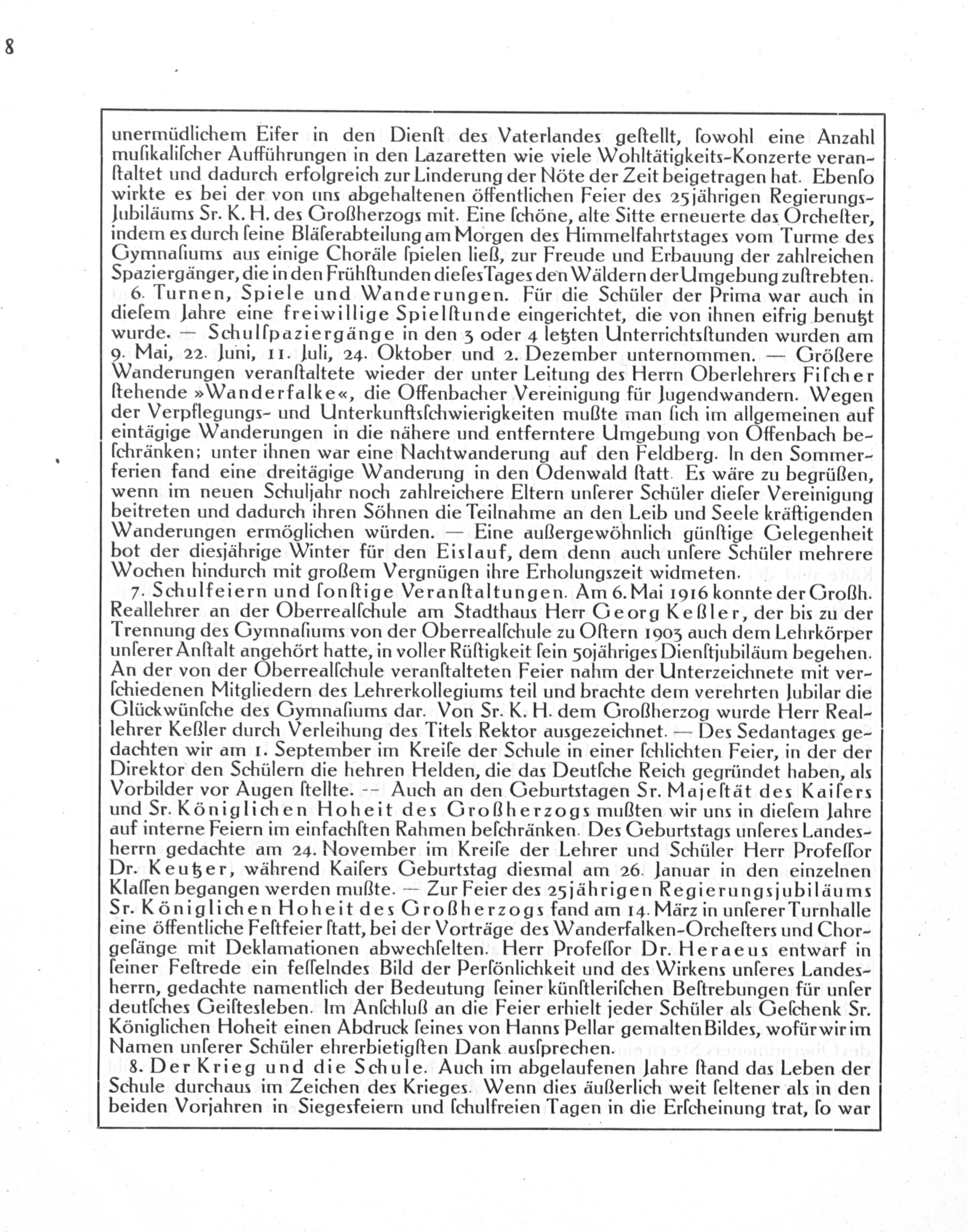 7. Schulfeiern und ſonſtige Veranſtaltungen. Am 6. Mai 1916 konnte der Großh. Reallehrer an der Oberrealſchule am Stadthaus Herr Georg Keßler, der bis zu der Trennung des Gymnalſiums von der Oberrealſchule zu Oſtern 1005 auch dem Lehrkörper unſerer Anſtalt angehört hatte, in voller Rüſtigkeit ſein 5Ojähriges Dienſtjubiläum begehen. An der von der Oberrealſchule veranſtalteten Feier nalun der Unterzeichnete mit ver- ſchiedenen Mitgliedern des Lehrerkollegiums teil und brachte dein verehrten lubilar die Glückwünſche des Gymnaſiums dar. Von Sr. K. H. dem Groſtherzog wurde Herr Real- lehrer Keßler durch Verleihung des Titels Rektor ausgezeichnet.— Des Sedantages ge- dachten wir am 1. September im Kreiſe der Schule in einer ſchlichten Feier, in der der Direktor den Schülern die hehren Helden, die das Deutſche Reich gegründet haben, als Vorbilder vor Augen ſtellte.— Auch an den Geburtstagen Sr. Majeſtät des Kaifers und Sr. Königlichen Hoheit des Großherzogs mußten wir uns in dieſem lahre auf interne Feiern im einfachſten Rahmen beſchränken. Des Geburtstags unſeres Landes- herrn gedachte am 24. Movember im Kreiſe der Lehrer und Schüler Herr Profelſſor Dr. Keutzer, während Kaiſers Geburtstag diesmal am 26. Januar in den einzelnen klaſſen begangen werden mußtte.— Zur Feier des 25jährigen Regierungsjubiläums Sr. Königlichen Hoheit des Großherzogs fand am 14. März in unferer Turnhalle eine öffentliche Feſtfeier ſtatt, bei der Vorträge des Wanderfalken-Orcheſters und Chor- gelänge mit Deklamationen abwechfelten. Herr Profeſlor Dr. Heraeus entwarf in ſeiner Feſtrede ein feſſelndes Bild der Perſönlichkeit und des Wirkens unſeres Landes- herrn, gedachte namentlich der Bedeutung ſeiner künſtleriſchen Beſtrebungen für unſer deutſches Geiſtesleben. lim Anſchluß an die Feier erhielt jeder Schüler als Geſchenk Sr. Königlichen Hoheit einen Abdruck ſeines von Hanns Pellar gemalten Bildes, wofürwir im Namen unferer Schüler ehrerbietigſten Dank ausſprechen.