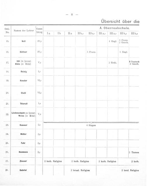 Ord. ſassen. A. Oberreals chule. Namen der Lehrer ſun No. nung la—21 Ila IIb., Ib, V IIIan IHIaz? IIIbA IIIb/ 112— ſ——— i——————————— —— An 6 Pranz. 15. Non WZ V b 4 Engl. 2 Gesch. rw—ęQAn·————-.... V V V 16. Büttner V IV, V 5 Franz. 5 Engl. V V V , u in unnan ee im Sommer. 3 Deutsch 17 Klein(im Wintee) Vn V ² Frdb 2 Gesch. ————— 18. Reinig 1u V V —————— V V V V 19. Kessler VII V b . V— — V—— V——— 20. Stahl VI= V I V ————NN 21. rhierolt 12 V V V V ———,y——üͤ-õↄ—-————— b I 59,„ 22. Lindenschmitt Eim Sommet) V?2 Weiss(im Winter) b V ——,————— 23. Kammer 2,1 b 4 Singen ——+ V——— 24. müller 24 V I „— b 25. Fuhr 3,2 I 26. Hammann 3,1 b 2 Turnen „, 27. Zinsser 2 kath. Religion 2 kath. Religion 2 kath. Religion 2 kath. 28. Gabriel 2 israel. Religion 2 isral. Religion