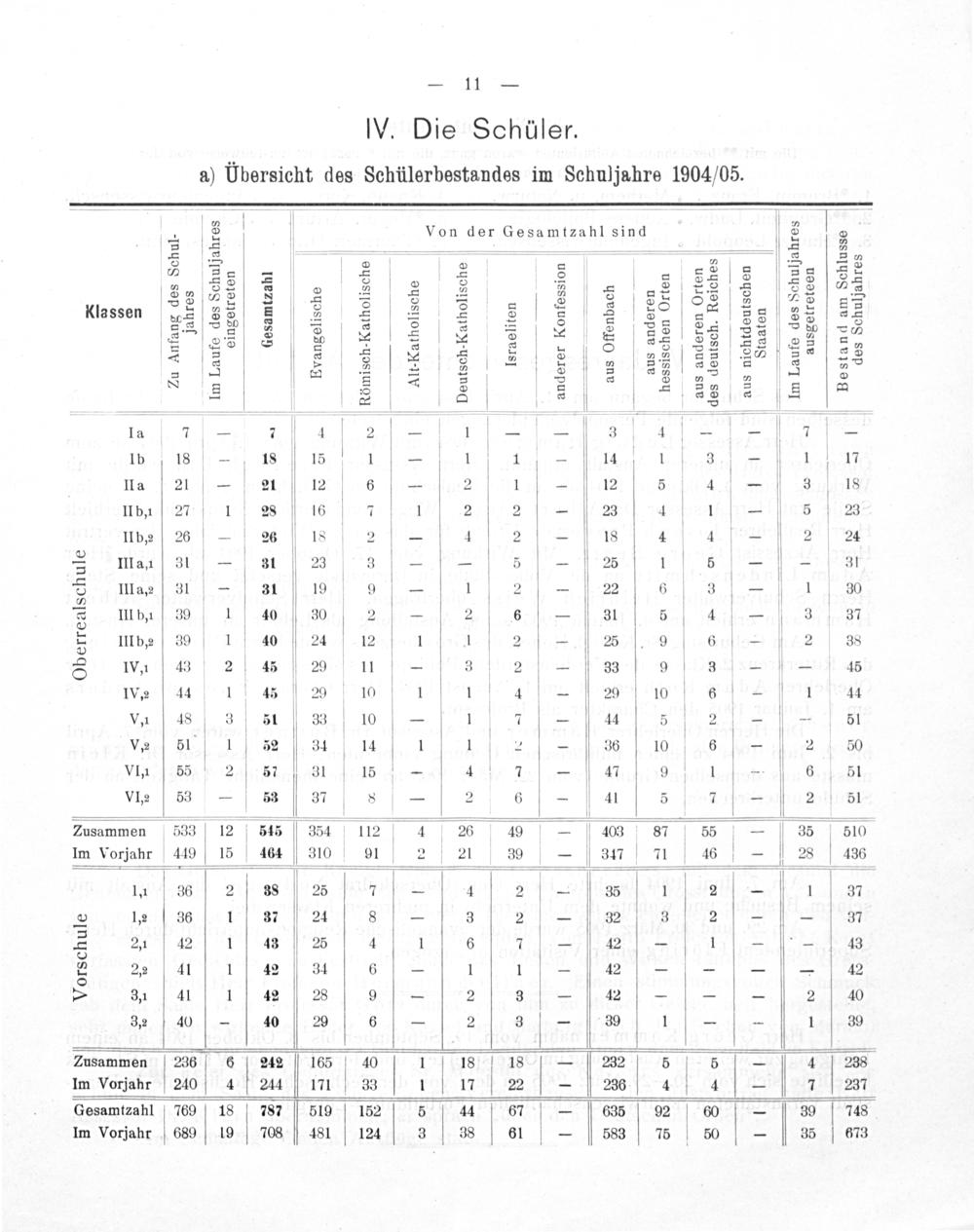 11 WV. Die Schüler. a) Übersicht des Schülerbestandes im Schuljahre 1904/05.