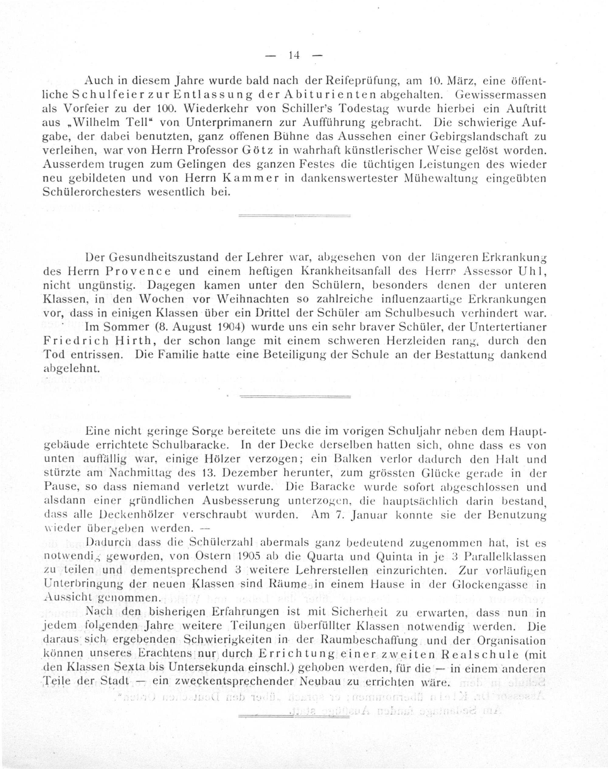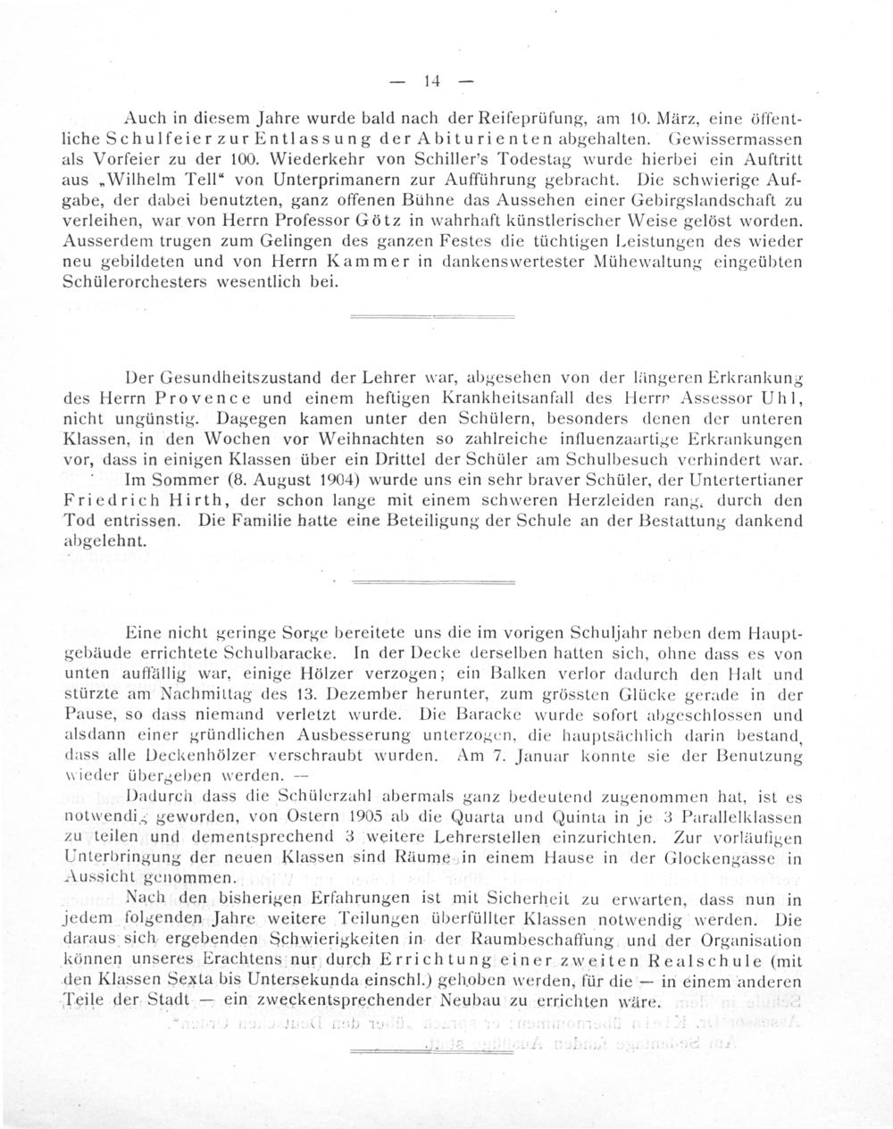 Im Sommer(8. August 1904) wurde uns ein sehr braver Schüler, der Untertertianer Friedrich Hirth, der schon lange mit einem schweren Herzleiden rang., durch den Tod entrissen. Die Familie hatte eine Beteiligung der Schule an der Bestattung dankend abgelehnt.