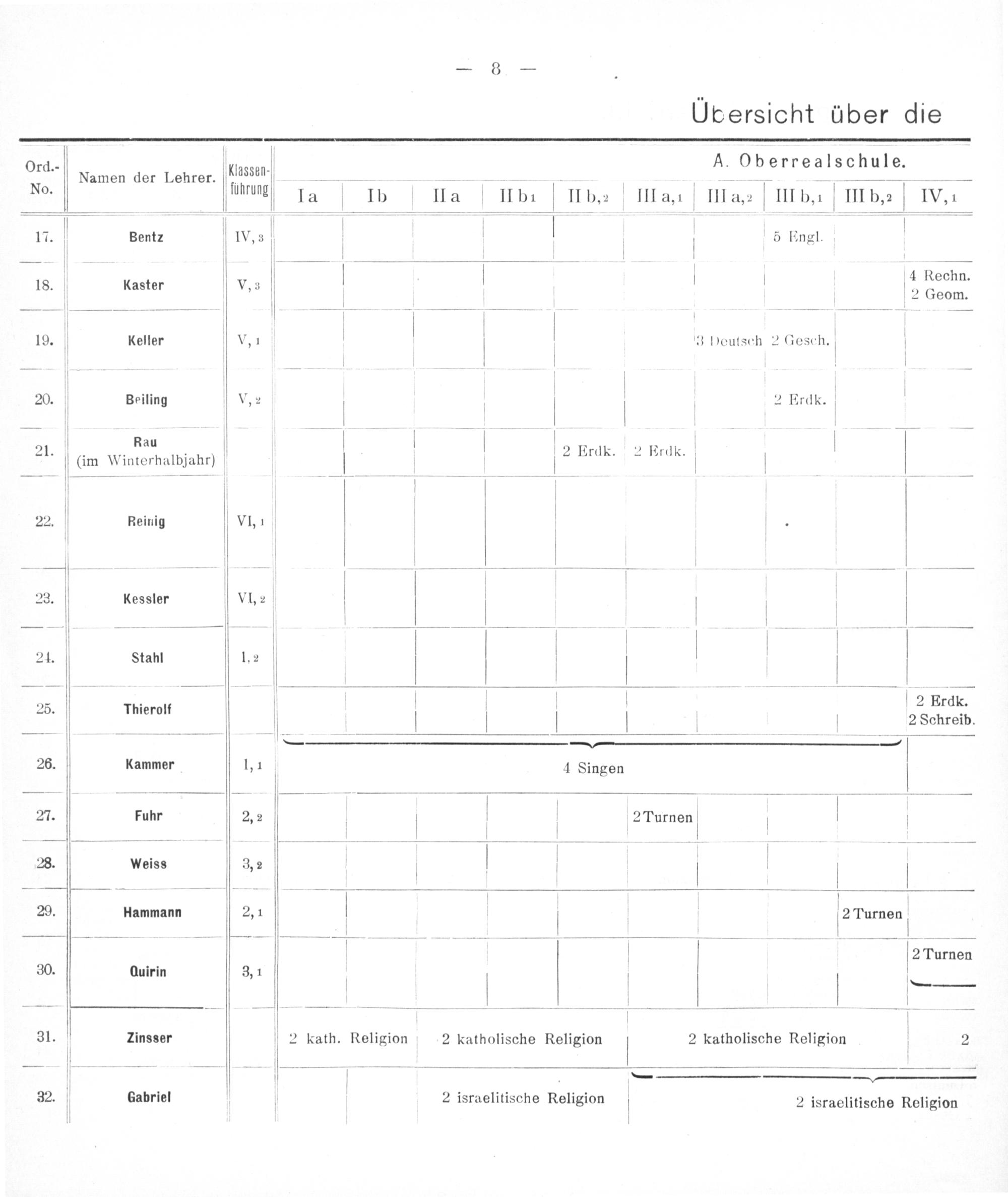 A. Oberrealschule. Namen der Lehrer.———.———4,— No. nung la Ib la lbe Ib. IIla, IIla.s IIIb.“ IIIb,IV.: ſ— ff R n 1 1 17. Bentz IV, 3 5 Engl — 1— 1 ¹———— V 4 Rechn. 18. Kaster V,. V 2 Geom. b——— 19. Keller V,R1 V 3 Deutsch 2 Gesch. V V V ———— 20. Beiling V, 2 Erdk. V V Rau 2 n 5 2 E. 2 Erdk. 2¹ m Winterhalbjahr) 2 Prälk. 2 Praln V V —————————— V 22. Reinig VI, I Y V V V ————— 4————— 23. Kessler VI, 2 V V V V V V 24. Stahl 1. 2 b ———— —————— 2 Rrdk. „: 25. Thierolf V V V 2 Schreib. ———————— 26. Kammer 1, 1 4 Singen I ———— V— V— 27. Fuhr 2, 2 V V V 2 Turnen 28. Weiss 3, 2 V V V V V V ————— ſ 29. Hammann 2, 1 V V V 2 Turnen V V 2 Turnen 30. Quirin 3, 1 V— 1— ———— 1——— V V V 31. Zinsser 2 kath. Religion 2 katholische Religion 2 katholische Religion V 2 V — 1——————— 32. Gabriel Z2 israclitische Religion