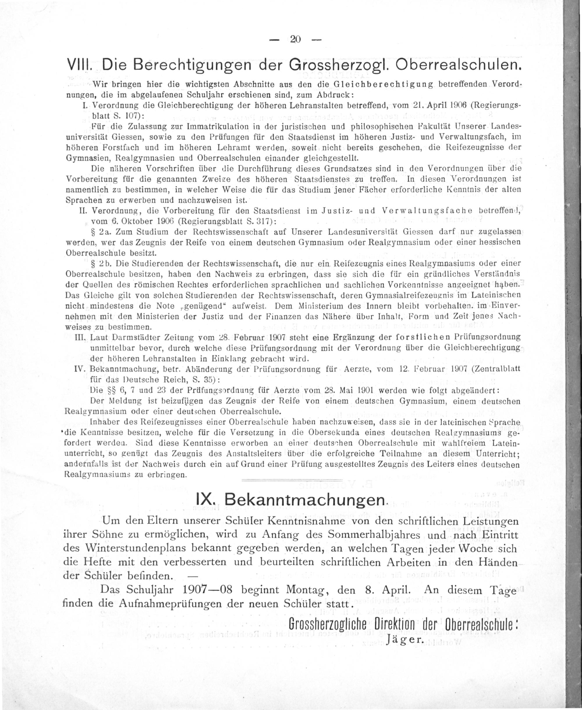 brossherzogliche Direktion der Oberrealschule: Jäger.