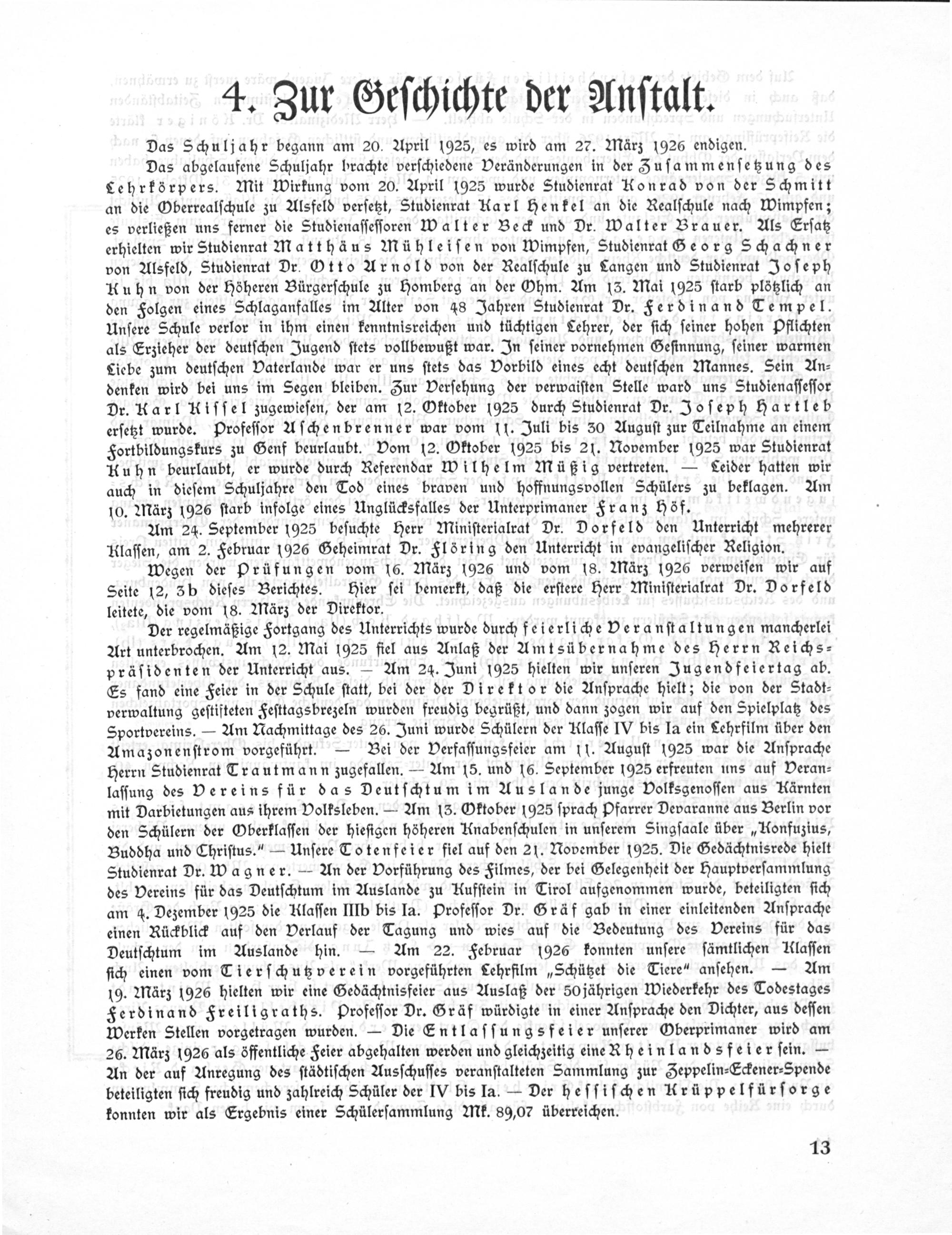 Das abgelaufene Schuljahr brachte verſchiedene Veränderungen in der Zuſammenſetzung des Lehrkörpers. Mit Wirkung vom 20. April 1925 wurde Studienrat Aonrad von der Schmitt an die Oberrealſchule zu Alsfeld verſetzt, Studienrat arl henkel an die Realſchule nach Wimpfen; es verließen uns ferner die Studienaſſeſſoren Malter Beck und Dr. Walter Brauer. Als Erſatz erhielten wir Studienrat Matthäus Mühleiſen von Wimpfen, Studienrat Georg Schachner von Alsfeld, Studienrat Dr. Otto Arnold von der Realſchule zu Langen und Studienrat Joſeph Kuhn von der höheren Bürgerſchule zu homberg an der Ohm. Am 13. Mai 1025 ſtarb plötzlich an den Folgen eines Schlaganfalles im Alter von 48 Jahren Studienrat Dr. Ferdinand Tempel. Unſere Schule verlor in ihm einen kenntnisreichen und tüchtigen Lehrer, der ſich ſeiner hohen Pflichten als Erzieher der deutſchen Jugend ſtets vollbewußt war. In ſeiner vornehmen Geſinnung, ſeiner warmen Liebe zum deutſchen Vaterlande war er uns ſtets das Vorbild eines echt deutſchen Mannes. Sein An⸗ denken wird bei uns im Segen bleiben. Zur Verſehung der verwaiſten Stelle ward uns Studienaſſeſſor Dr. Karl Uiſſel zugewieſen, der am 12. Oktober 1025 durch Studienrat Dr. Joſeph hartleb erſetzt wurde. Profeſſor Aſchenbrenner war vom 11. Juli bis 30 Auguſt zur Teilnahme an einem Fortbildungskurs zu Genf beurlaubt. Vom 12. Oktober 1925 bis 21. November 1925 war Studienrat Kuhn beurlaubt, er wurde durch Referendar Wilhelm Müßig vertreten.— Leider hatten wir auch in dieſem Schuljahre den Tod eines braven und hoffnungsvollen Schülers zu beklagen. Am 10. März 1926 ſtarb infolge eines Unglücksfalles der Unterprimaner Franz höf.
