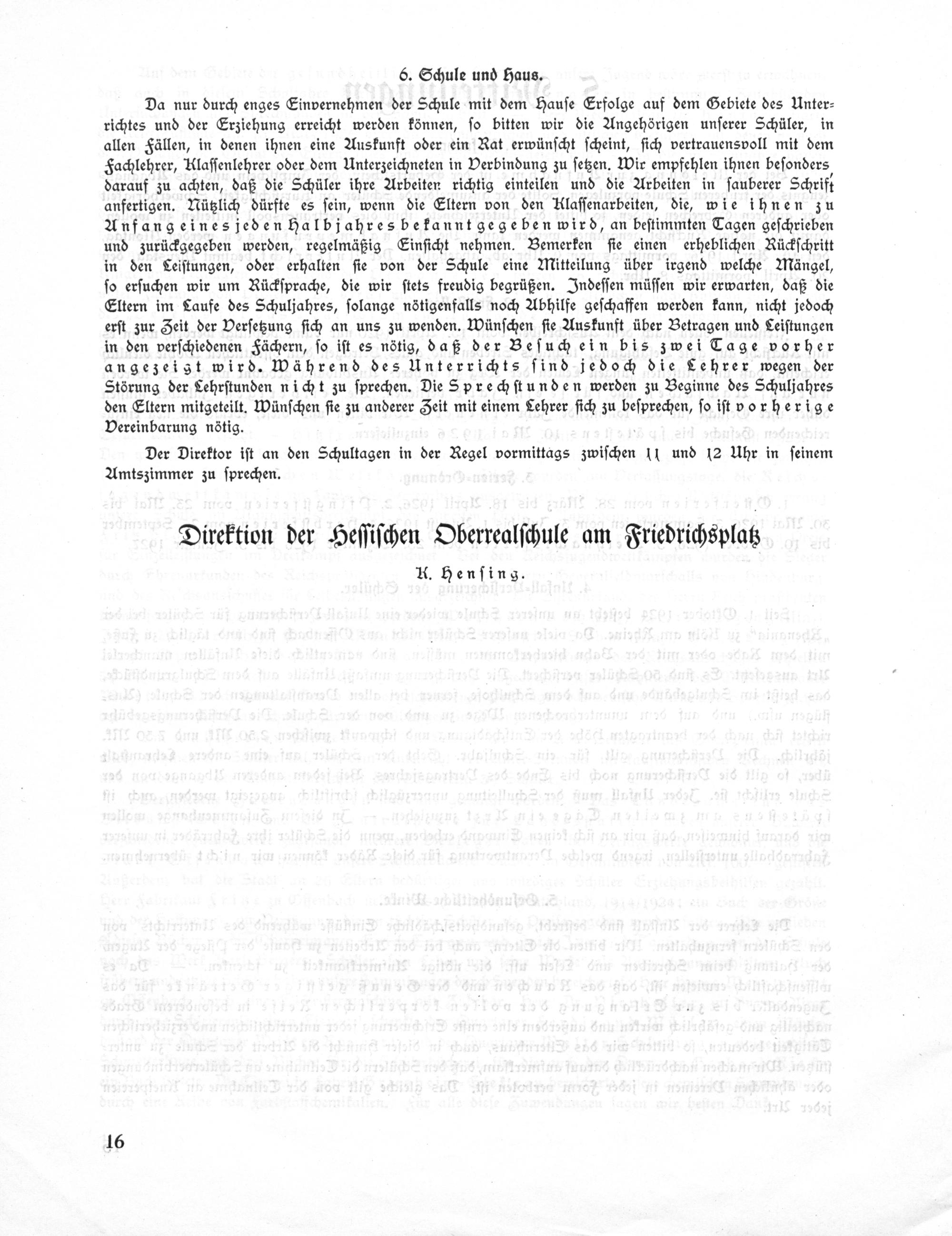 Da nur durch enges Sinvernehmen der Schule mit dem Hauſe Erfolge auf dem Gebiete des Unter⸗ richtes und der Erziehung erreicht werden können, ſo bitten wir die Angehörigen unſerer Schüler, in allen Fällen, in denen ihnen eine Auskunft oder ein Rat erwünſcht ſcheint, ſich vertrauensvoll mit dem Fachlehrer, Klaſſenlehrer oder dem Unterzeichneten in Verbindung zu ſetzen. Wir empfehlen ihnen beſonders darauf zu achten, daß die Schüler ihre Arbeiten richtig einteilen und die Arbeiten in ſauberer Schrift anfertigen. Mützlich dürfte es ſein, wenn die Eltern von den Klaſſenarbeiten, die, wie ihnen zu Anfangeines jeden halbjahresbekanntgegeben wird, an beſtimmten Tagen geſchrieben und zurückgegeben werden, regelmäßig Einſicht nehmen. Bemerken ſie einen erheblichen Rückſchritt in den Leiſtungen, oder erhalten ſie von der Schule eine Mitteilung über irgend welche Mängel, ſo erſuchen wir um Rückſprache, die wir ſtets freudig begrüßen. Indeſſen müſſen wir erwarten, daß die Eltern im Laufe des Schuljahres, ſolange nötigenfalls noch Abhilfe geſchaffen werden kann, nicht jedoch erſt zur Zeit der Verſetzung ſich an uns zu wenden. Wünſchen ſie Auskunft über Betragen und Leiſtungen in den verſchiedenen Fächern, ſo iſt es nötig, daß der Beſuch ein bis zwei Tage vorher angezeigst wird. Während des Unterrichts ſind jedoch die Lehrer wegen der Störung der Lehrſtunden nicht zu ſprechen. Die Sprechſtunden werden zu Beginne des Schuljahres den Eltern mitgeteilt. Wünſchen ſie zu anderer Zeit mit einem Lehrer ſich zu beſprechen, ſo iſt vorherige Vereinbarung nötig.