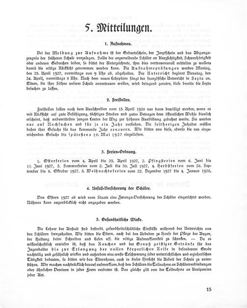 Bei der Meldung zur Aufnahme iſt der Geburtsſchein, der Impfſchein und das Abgangs⸗ zeugnis der früheren Schule vorzulegen. Sollte der anzumeldende Schüler an Aurzſichtigkeit, Schwerhörigkeit oder anderen Gebrechen leiden, ſo bittet der Unterzeichnete, ihm dies vertrauensvoll mitteilen zu wollen⸗ damit die nötige Rückſicht genommen werden kann. Die Aufnahmeprüfungen werden Montag, den 25. April 1027, vormittags von 9 Uhr ab, abgehalten. Der Unterricht beginnt Dienstag, den 26. April, vormittags 8 Uhr. Nach dem neuen Lehrplane fängt der franzöſiſche Unterricht in Sexta an. Eltern, die ihre Söhne unſerer Schule anvertrauen wollen, wird dringend geraten, dieſe bereits die Sexta beſuchen zu laſſen.