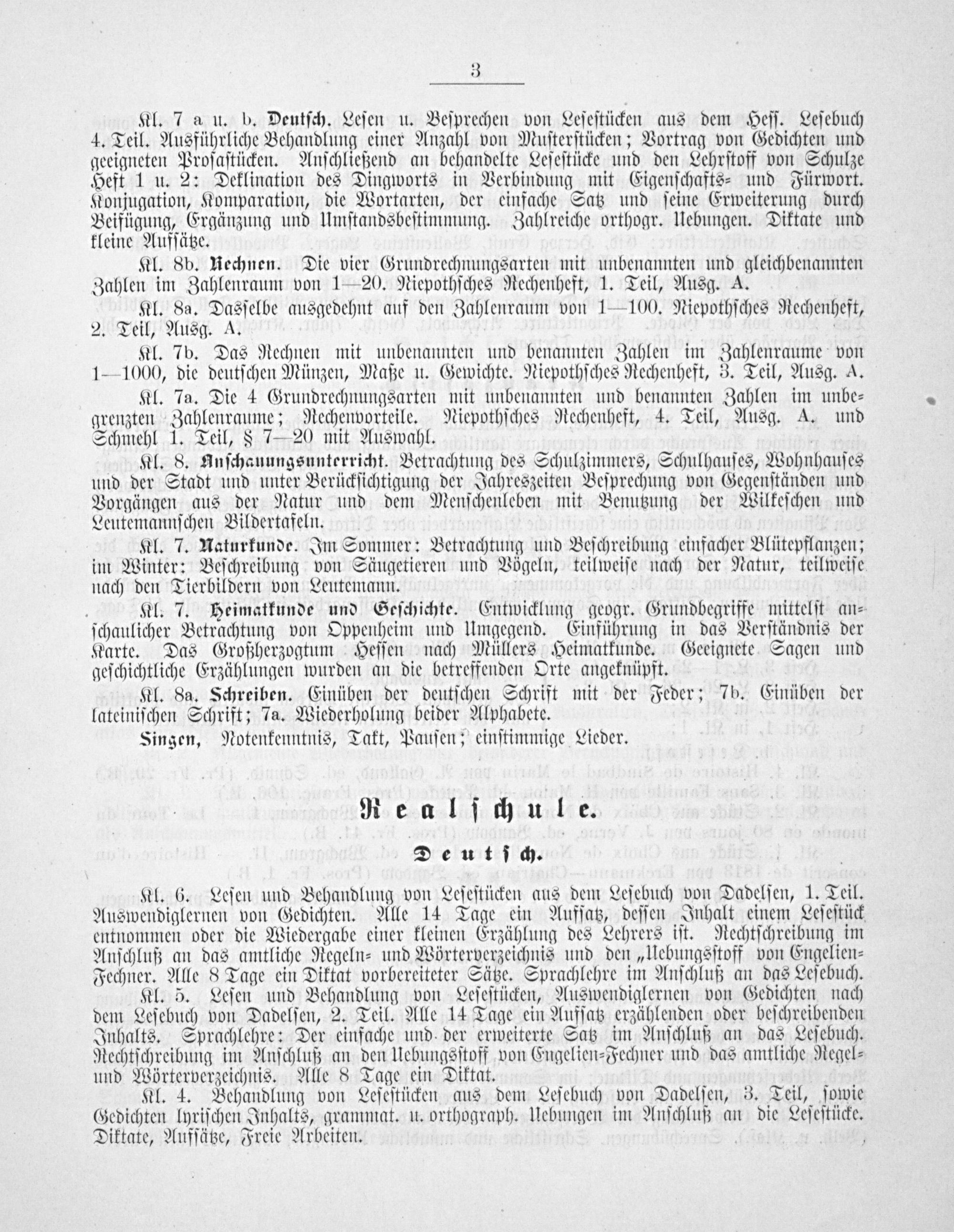 Kl. 7. Heimatkunde und Geſchichte. Entwicklung geogr. Grundbegriffe mittelſt an⸗ ſchaulicher Betrachtung von Oppenheim und Umgegend. Einführung in das Verſtändnis der Karte. Das Großherzogtum Heſſen nach Müllers Heimatkunde. Geeignete Sagen und geſchichtliche Erzählungen wurden an die betreffenden Orte angeknüpft.