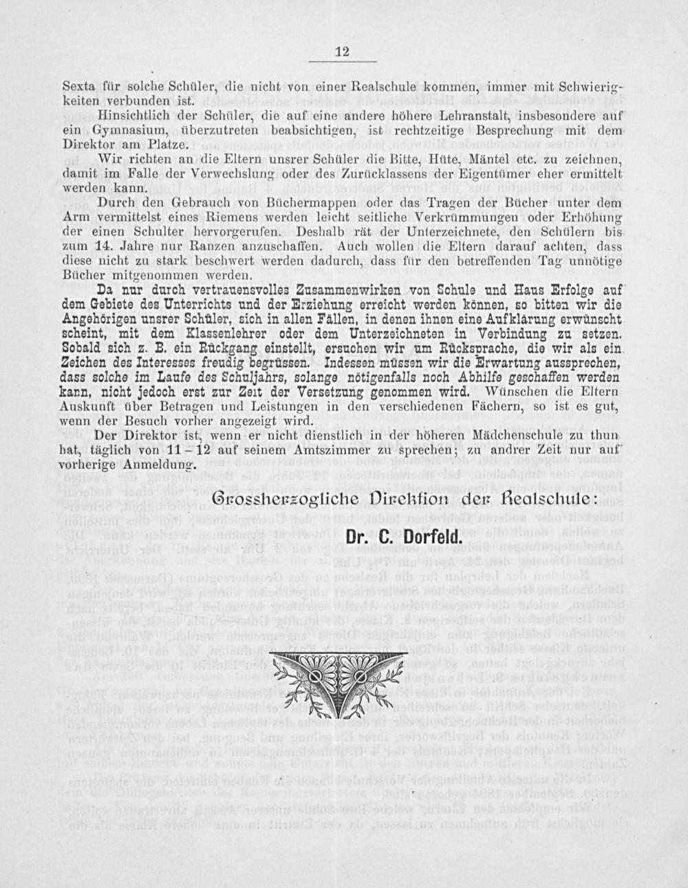 Durch den Gebrauch von Büchermappen oder das Tragen der Bücher unter dem Arm vermittelst eines Riemens werden leicht seitliche Verkrümmungen oder Erhöhung der einen Schulter hervorgerufen. Deshalb rät der Unterzeichnete, den Schülern bis zum 14. Jahre nur Ranzen anzuschaffen. Auch wollen die Eltern darauf achten, dass diese nicht zu stark beschwert werden dadurch, dass für den betreffenden Tag unnötige Bücher mitgenommen werden.