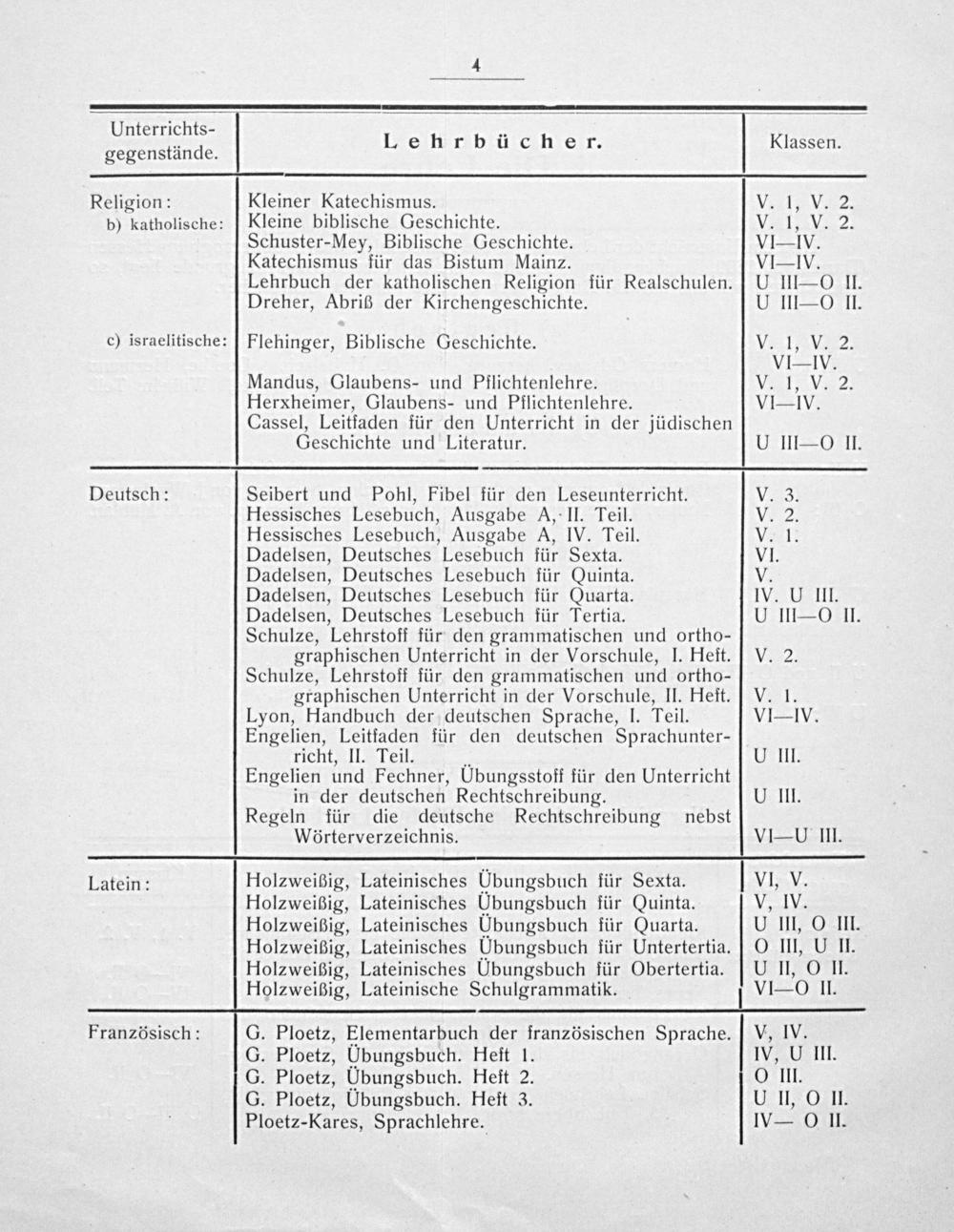 Unterrichts Lehrbücher. Klassen. gegenstände. Religion: Kleiner Katechismus. V. 1, V. 2. b) katholische: Kleine biblische Geschichte. V. l, V. 2 Schuster-Mey, Biblische Geschichte. VIV. Katechismus für das Bistum Mainz. VI—IV. Lehrbuch der katholischen Religion für Realschulen.— U III— O II. Dreher, Abriß der Kirchengeschichte. U III O II. c) israelitische: Flehinger, Biblische Geschichte. V. 1, V. 2. V-IV. Mandus, Glaubens- und Pflichtenlehre. V. 1, V. 2. Herxheimer, Glaubens- und Pflichtenlehre. VI-—IVV. Cassel, Leitfaden für den Unterricht in der jüdischen Geschichte und Literatur. U II= O II. Deutsch: Seibert und Pohl, Fibel für den Leseunterricht. V. 3. Hessisches Lesebuch, Ausgabe A, II. Teil. V. 2. Hessisches Lesebuch, Ausgabe A, IV. Teil. V. 1. Dadelsen, Deutsches Lesebuch für Sexta. VI. Dadelsen, Deutsches Lesebuch für OQuinta. V. Dadelsen, Deutsches Lesebuch für Quarta. 1V. U III. Dadelsen, Deutsches Lesebuch für Tertia. U III= O II Schulze, Lehrstoff für den grammatischen und ortho- graphischen Unterricht in der Vorschule, I. Heft. V. 2. Schulze, Lehrstoff für den grammatischen und ortho- graphischen Unterricht in der Vorschule, II. Heft. V. 1. Lyon, Handbuch der deutschen Sprache, I. Teil. V-IV. Engelien, Leitfaden für den deutschen Sprachunter- richt, Il. Teil. U III. Engelien und Fechner, Ubungsstoff für den Unterricht in der deutschen' Rechtschreibung. U Ill. Regeln für die deutsche Rechtschreibung nebst Wörterverzeichnis. V=ẽCUIII. Latein: Holzweißig, Lateinisches Ubungsbuch für Sexta. VI, V. Holzweißig, Lateinisches UÜbungsbuch für Quinta. V, VV. Holzweißig, Lateinisches UÜbungsbuch für Quarta. U IIl, O III. Holzweißig, Lateinisches UÜbungsbuch für Untertertia. Q III, U II. Holzweißig, Lateinisches UÜbungsbuch für Obertertia. U IlI, O II. Holzweißig, Lateinische Schulgrammatik. VI=—SO II. Französisch: G. Ploetz, Elementarbuch der französischen Sprache. V, IV. G. Ploetz, Ubungsbuch. Heft l. IV, U IIlI. G. Ploetz, UÜbungsbuch. Heft 2. O III. G. Ploetz, Übungsbuch. Heft 3. U II, O Il. Ploetz-Kares, Sprachlehre. IV— O II.
