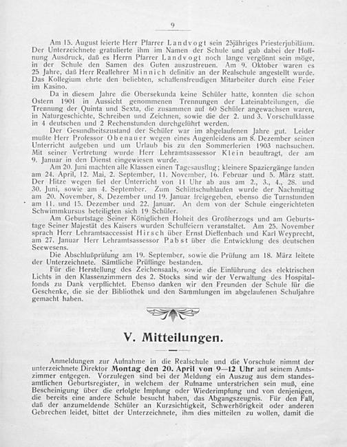 Der Gesundheitszustand der Schüler war im abgelaufenen Jahre gut. Leider mußte Hlerr Professor Obenauer wegen eines Augenſeidens am 8. Dezember seinen Unterricht aufgeben und um Urlaub bis zu den Sommerferien 1903 nachsuchen. Mit seiner Vertretung wurde Herr Lehramtsassessor Klein beauftragt, der am 9. Januar in den Dienst eingewiesen wurde.