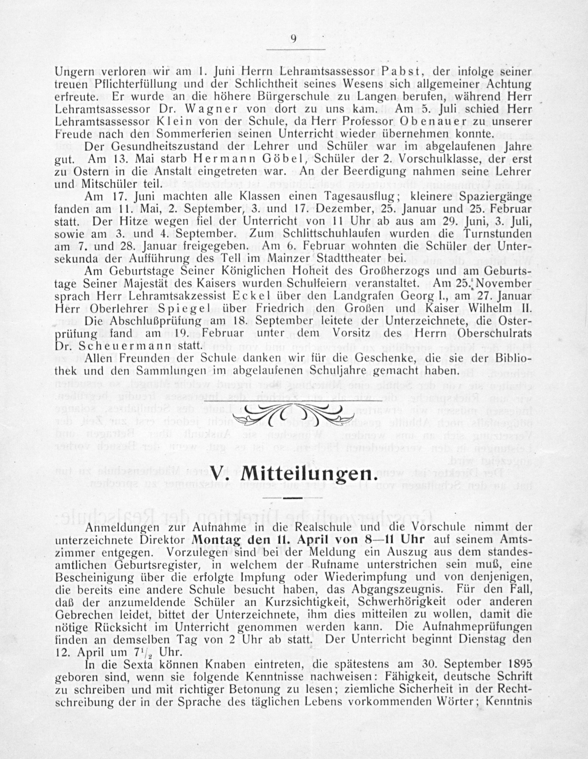 Ungern verloren wir am 1. Juni Herrn Lehramtsassessor Pabst, der infolge seiner treuen Pflichterfüllung und der Schlichtheit seines Wesens sich allgemeiner Achtung erfreute. Er wurde an die höhere Bürgerschule zu Langen berufen, während Herr Lehramtsassessor Dr. Wagner von dort zu uns kam. Am 5. jJuli schied Herr Lehramtsassessor Klein von der Schule, da Herr Professor Obenauer zu unserer Freude nach den Sommerferien seinen Unterricht wieder übernehmen konnte.