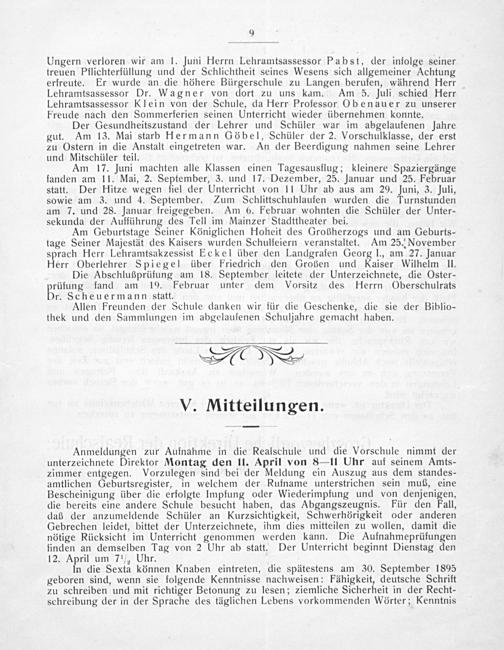 Die Abschlußprüfung am 18. September leitete der Unterzeichnete, die Oster- prüfung fand am 19. Februar unter dem Vorsitz des Herrn Oberschulrats Dr. Scheuermann statt.