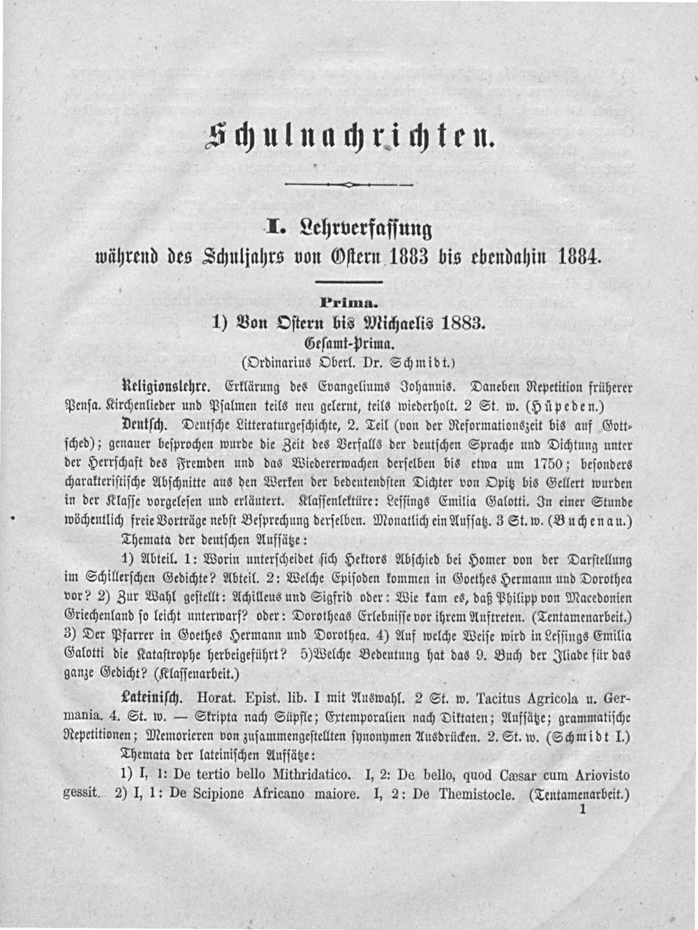 1) Von Oſtern bis Michaelis 1883. Geſamt-Prima. (Ordinarius Oberl. Dr. Schmidt.)