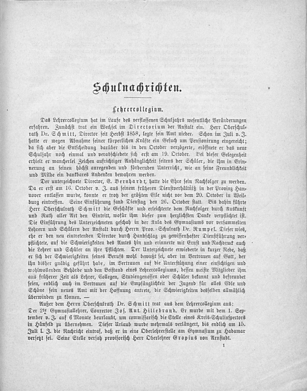 Der unterzeichnete Director, E. Bernhardt, hatte die Ehre ſein Nachfolger zu werden. Da er erſt am 16. October v. J. aus ſeinem früheren Dienſtverhältniß in der Provinz Han⸗ nover entlaſſen wurde, konnte er trotz der größten Eile nicht vor dem 20. October in Weil⸗ burg eintreffen. Seine Einführung fand Dienſtag den 26. October ſtatt. Bis dahin führte Herr Oberſchulrath Schmitt die Geſchäfte und erleichterte dem Nachfolger durch Auskunft und Rath aller Art den Eintritt, wofür ihm dieſer zum herzlichſten Danke verpflichtet iſt. Die Einführung des Unterzeichneten geſchah in der Aula des Gymnaſiums vor verſammelten Lehrern und Schülern der Anſtalt durch Herrn Prov.⸗Schulrath Dr. Rumpel. Dieſer wies, ehe er den neu eintretenden Director durch Handſchlag zu gewiſſenhafter Dienſtführung ver⸗ pflichtete, auf die Schwierigkeiten des Amtes hin und erinnerte mit Ernſt und Nachdruck auch die Lehrer und Schüler an ihre Pflichten. Der Unterzeichnete erwiederte in kurzer Rede, daß er ſich der Schwierigkeiten ſeines Berufs wohl bewußt ſei, aber im Vertrauen auf Gott, der