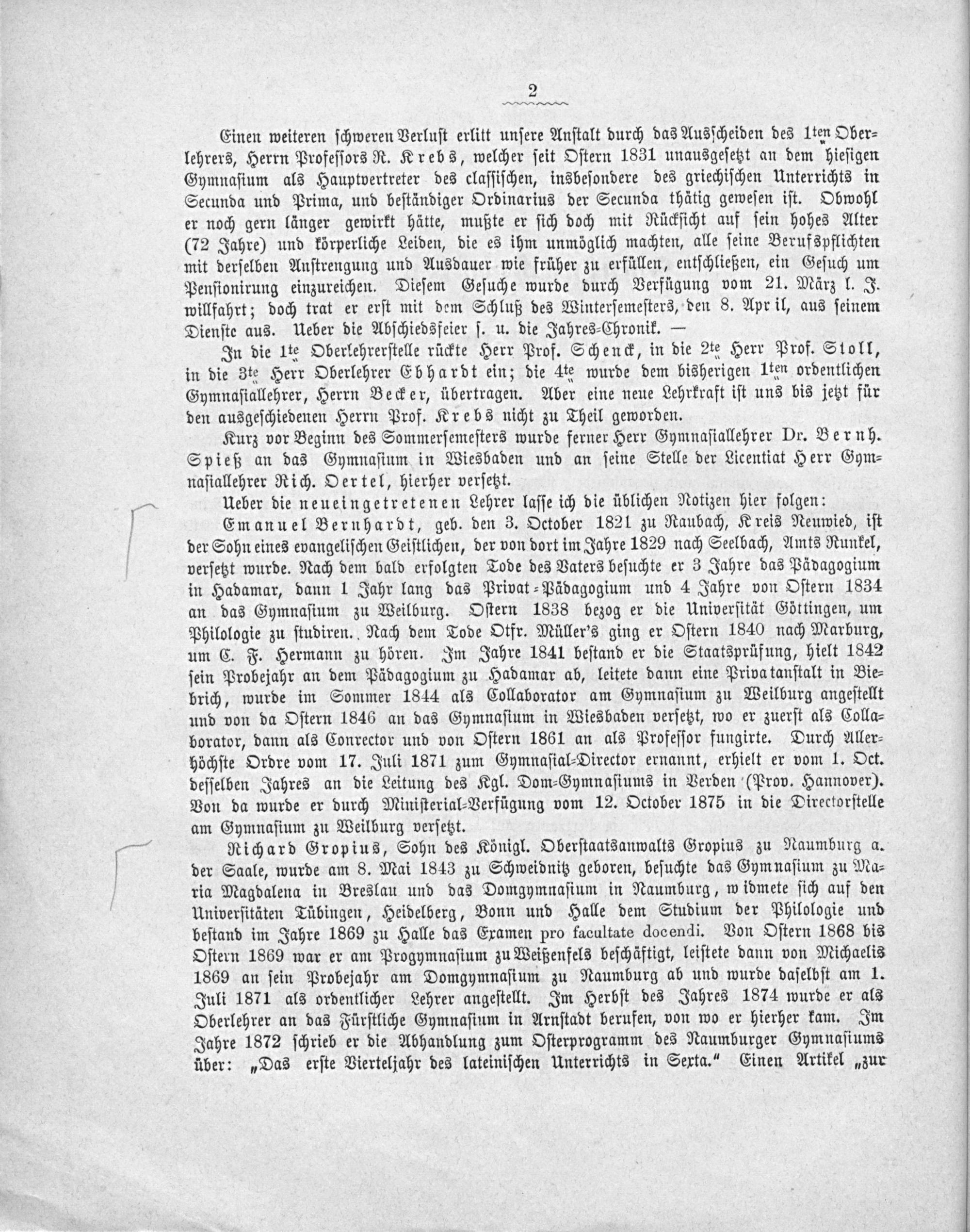 Emanuel Bernhardt, geb. den 3. October 1821 zu Raubach, K reis Neuwied, iſt der Sohn eines evangeliſchen Geiſtlichen, der von dort im Jahre 1829 nach Seelbach, Amts Runkel, verſetzt wurde. Nach dem bald erfolgten Tode des Vaters beſuchte er 3 Jahre das Pädagogium in Hadamar, dann 1 Jahr lang das Privat⸗Pädagogium und 4 Jahre von Oſtern 1834 an das Gymnaſium zu Weilburg. Oſtern 1838 bezog er die Univerſität Göttingen, um Philologie zu ſtudiren. Nach dem Tode Otfr. Müller's ging er Oſtern 1840 nach Marburg, um C. F. Hermann zu hören. Im Jahre 1841 beſtand er die Staatsprüfung, hielt 1842 ſein Probejahr an dem Pädagogium zu Hadamar ab, leitete dann eine Priva tanſtalt in Bie⸗ brich, wurde im Sommer 1844 als Collaborator am Gymnaſium zu Weilburg angeſtellt und von da Oſtern 1846 an das Gymnaſium in Wiesbaden verſetzt, wo er zuerſt als Colla⸗ borator, dann als Conrector und von Oſtern 1861 an als Profeſſor fungirte. Durch Aller⸗ höchſte Ordre vom 17. Juli 1871 zum Gymnaſial⸗Director ernannt, erhielt er vom 1. Oct. deſſelben Jahres an die Leitung des Kgl. Dom⸗Gymnaſiums in Verden(Prov. Hannover). Von da wurde er durch Miniſterial⸗Verfügung vom 12. October 1875 in die Directorſtelle am Gymnaſium zu Weilburg verſetzt.