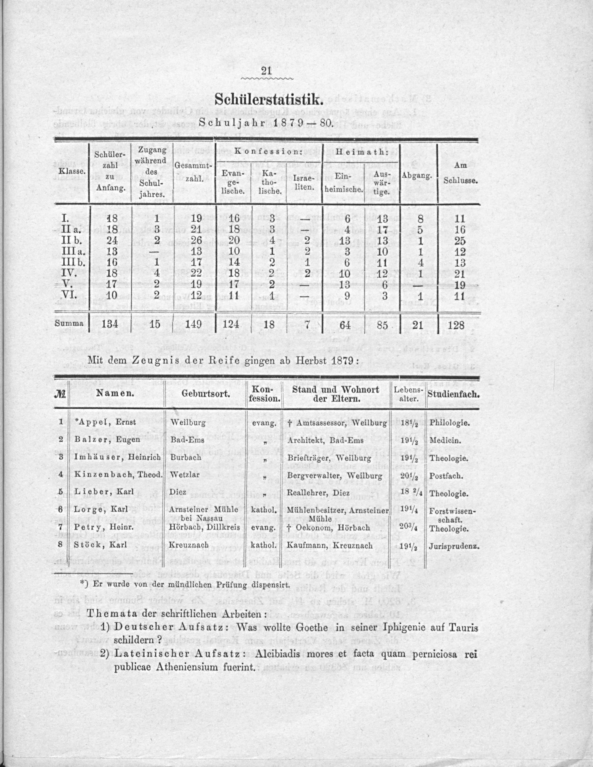 Schüler- 2u2ans Konfession: Heimath: Klasse zahl Daren Gesammt- Am . es 4.—. 2u Schul- zahl. Beun he. Israe- Pin. 8 Abgang. Schlusse. Anfang. jahres. Hsche. lische. liten.[heimische. tige. I. 18 1 19 16 3— 6 13 8 11 II a. 18 3 21 18 3— 4 17 5 16 II b. 24 2 26 20 4 2 13 13 1 25 IIIa. 13— 13 10 1 2 3 10 1 12 IIIb. 16 1 47 14 2 1 6 11 4 13 IV. 18 4 22 18 2 2 10 12 1 21 V. 47 2 19 17 2— 13 6— 19 VI. 10 2 12 11 1— 9 3 4 11 ——-—u— Summa] 131 15 149 124 1s 7 64 85 21 128 Mit dem Zeugnis der Reife gingen ab Herbst 1879: ———————— Kon- Stand und Wohnort Lebens- S a No. Namen. Geburtsort. fessi on. V Aer Eltern. Alter. Sinaientach. — 1 Appel, Ernst Weilburg evang. † Amtsassessor, Weilburg 18 ½ Philologie. 2 Balzer, Eugen Bad-Ems„ Architekt, Bad-Ems 19 ½ Mediecin. 3 Imhäuser, Heinrich Burbach„ Briefträger, Weilburg 19 ½ Theologie. 4 Kinzenbach, Theod. Wetalar„ Bergverwalter, Weilburg 20 ½ Postfach. 5 Lieber, Karl Diez„ Reallehrer, Diez 18 ༠Theologie. 6 Lorge, Karl Arnsteiner Mühle kathol. Mühlenbesitzer, Arnsteiner 19 ¼ Forstwissen- bei Nassau Mühle schaft. 7 Petry, Heinr. Hörbach, Dillkreis evang. † Oekonom, Hörbach 20 ¾ Theologie. 8 Stöck, Karl Kreuznach kathol. Kaufmann, Kreuznach 19 ½ Jurisprudenz.