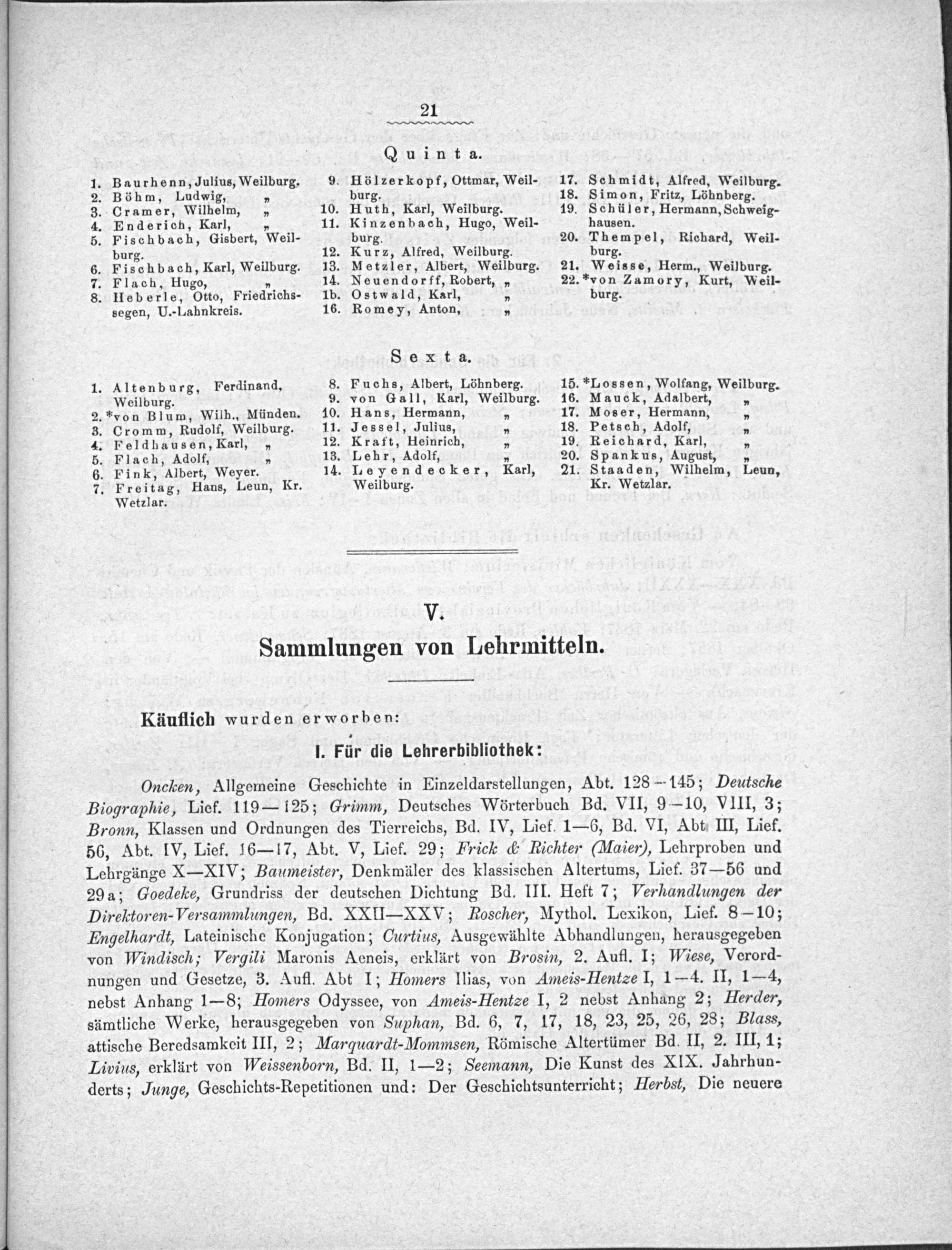 Onckhen, Allgemeine Geschichte in Einzeldarstellungen, Abt. 128— 145; Deutsche Biographie, Liof. 119— 125; Grimm, Deutsches Wörterbuch Bd. VII, 9— 10, VIII, 3; Bronn, Klassen und Ordnungen des Tierreichs, Bd. IV, Lief. 1— 6, Bd. VI, Abt III, Lief. 56, Abt. IV, Lief. 16— 17, Abt. V, Lief. 29; Frick d Richter(Maier), Lehrproben und Lehrgänge X-— XIV; Baumeister, Denkmäler des klassischen Altertums, Lief. 37— 56 und 29 a; Goedeke, Grundriss der deutschen Dichtung Bd. III. Heft 7; Verhandlungen der Direktoren-Versammlungen, Bd. XXII—XXV; Roscher, Mythol. Lexikon, Lief. 8— 10; Engelhardt, Lateinische Konjugation; Curtius, Ausgewäühlte Abhandlungen, herausgegeben von Windisch, Vergili Maronis Aeneis, erklürt von Brosin, 2. Aufl. I; Wiese, Verord- nungen und Gesetze, 3. Aufl. Abt I; Homers Ilias, von Ameis-Hentze I, 1—4. II, 1-— 4, nebst Anhang 1— 8; Homers Odyssee, von Ameis-Hentze I, 2 nebst Anhang 2; Herder, sämtliche Werke, herausgegeben von Suphan, Bd. 6, 7, 17, 18, 23, 25, 26, 28; Blass, attische Beredsamkeit III, 2; Marquardt-Mommsen, Römische Altertümer Bd. II, 2. III, 1; Livius, erklürt von Weissenborn, Bd. II, 1—2; Seemann, Die Kunst des XIX. Jahrhun- derts; Junge, Geschichts-Repetitionen und: Der Geschichtsunterricht; Herbst, Die neuere