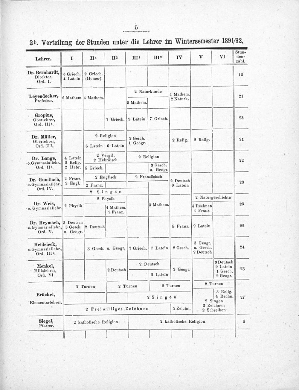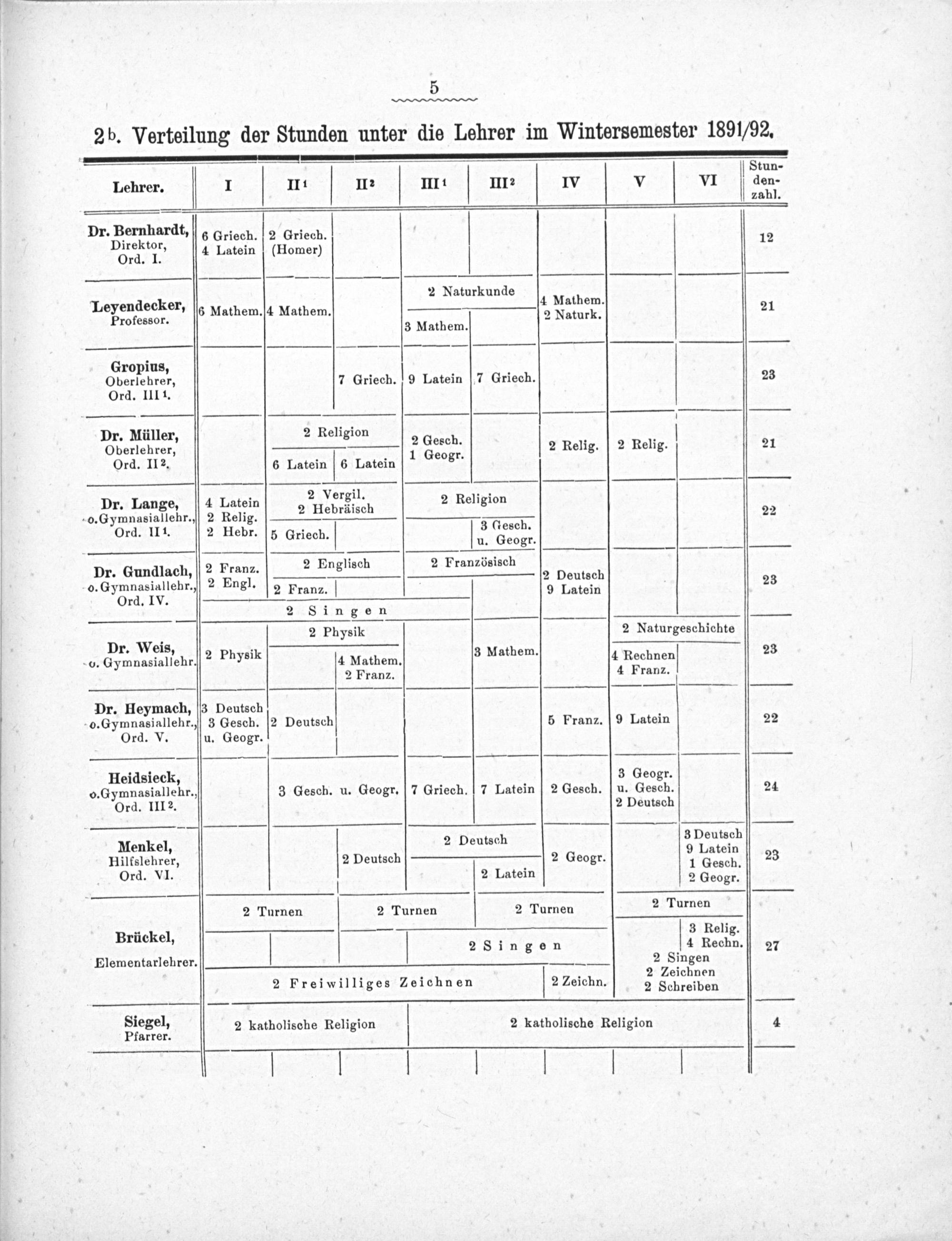 2 b. Verteilung der Stunden unter die Lehrer im Wintersemester 1891/92.