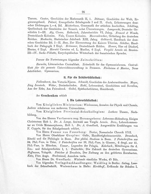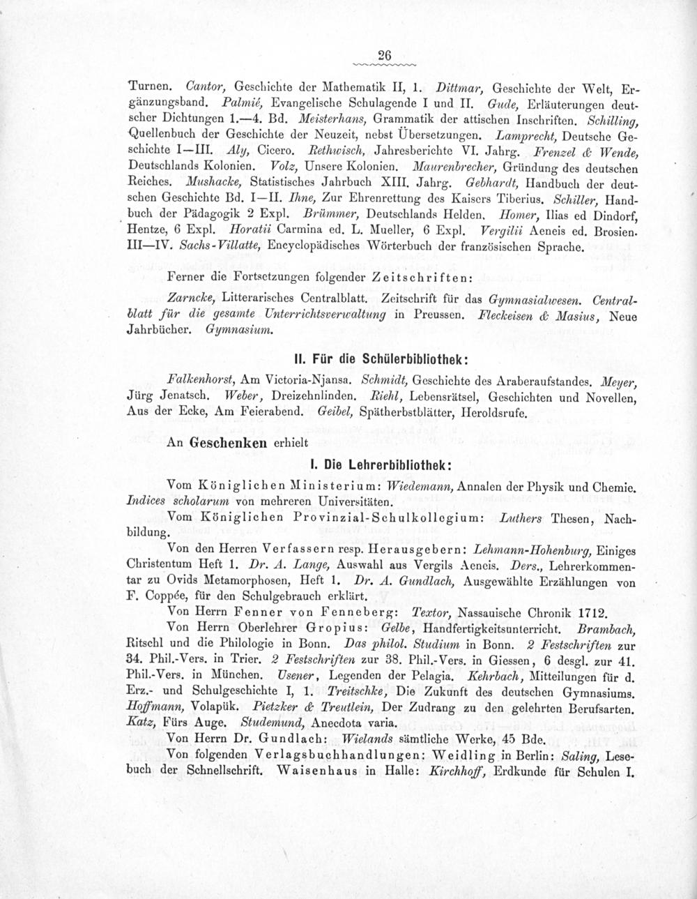 Von Herrn Oberlehrer Gropius: Gelbe, Handfertigkeitsunterricht. Brambach, Ritschl und die Philologie in Bonn. Das philol. Studium in Bonn. 2 PFestschriften zur 34. Phil.-Vers. in Trier. 2 Festschriften zur 38. Phil.-Vers. in Giessen, 6 desgl. zur 41. Phil.-Vers. in München. Usener, Legenden der Pelagia. Kehrbach, Mitteilungen für d. Erz.- und Schulgeschichte I, 1. Treitschle, Die Zukunft des deutschen Gymnasiums. Holfmann, Volapük. Pietæker& Treutlein, Der Zudrang zu den gelehrten Berufsarten. Katz, Fürs Auge. Studemund, Anecdota varia.