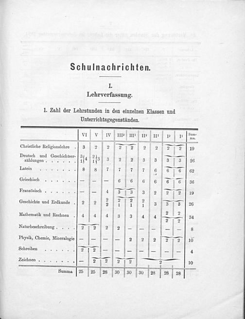 vVI V WV. nm I Le e Sum. Christliche Religionslehre. 3 2 2 2ſ2 2 2 22 19 Dauiiungen..-eirer 14 16 8 22 3 2 2 ſ32s Lat........ s[7[6.E 8 Griechisch.......——- 6[6[6 6 6 5 36 Französisch...-— 4 3 3 3 2 2 2 19 Geschichte und Erdkunde 2 2 2 2 2 2 3 3 3 26 Mathematik und Rechnen 4 4 4 3 3 4 4 2 34 Naturbeschreibung... 2 2 2 2————— 8 Physik, Chemie, Mineralogie———— 2 2 2 2 16 Schreiben...... 212——————— 4 Zeichnen......— 2 2 22—— 10