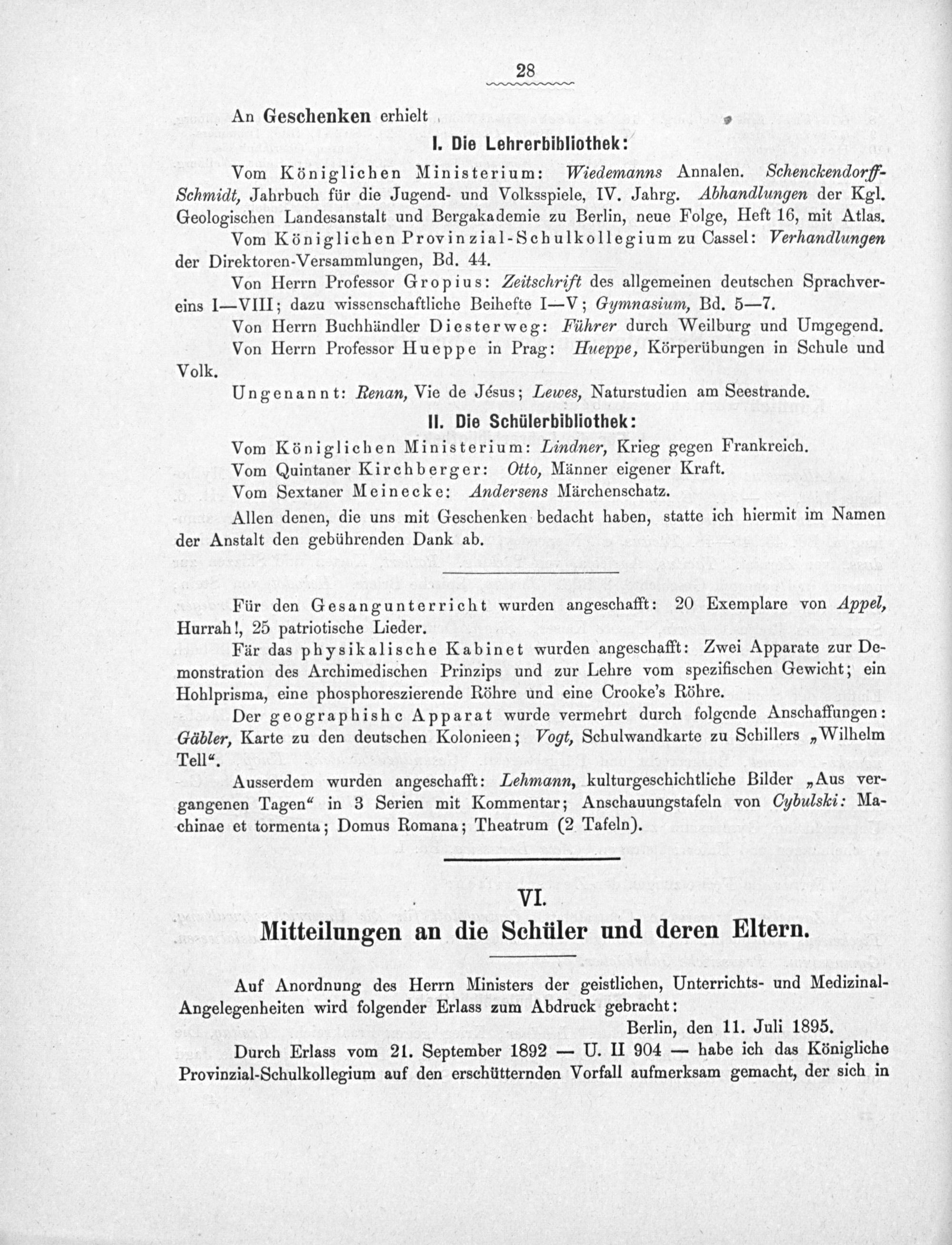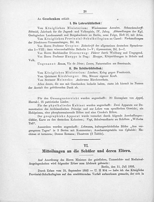 II. Die Schülerbibliothek: Vom Königlichen Ministerium: Lindner, Krieg gegen Frankreich. Vom Quintaner Kirchberger: Otto, Männer eigener Kraft. Vom Sextaner Meinecke: Andersens Märchenschatz. Allen denen, die uns mit Geschenken bedacht haben, statte ich hiermit im Namen der Anstalt den gebührenden Dank ab.