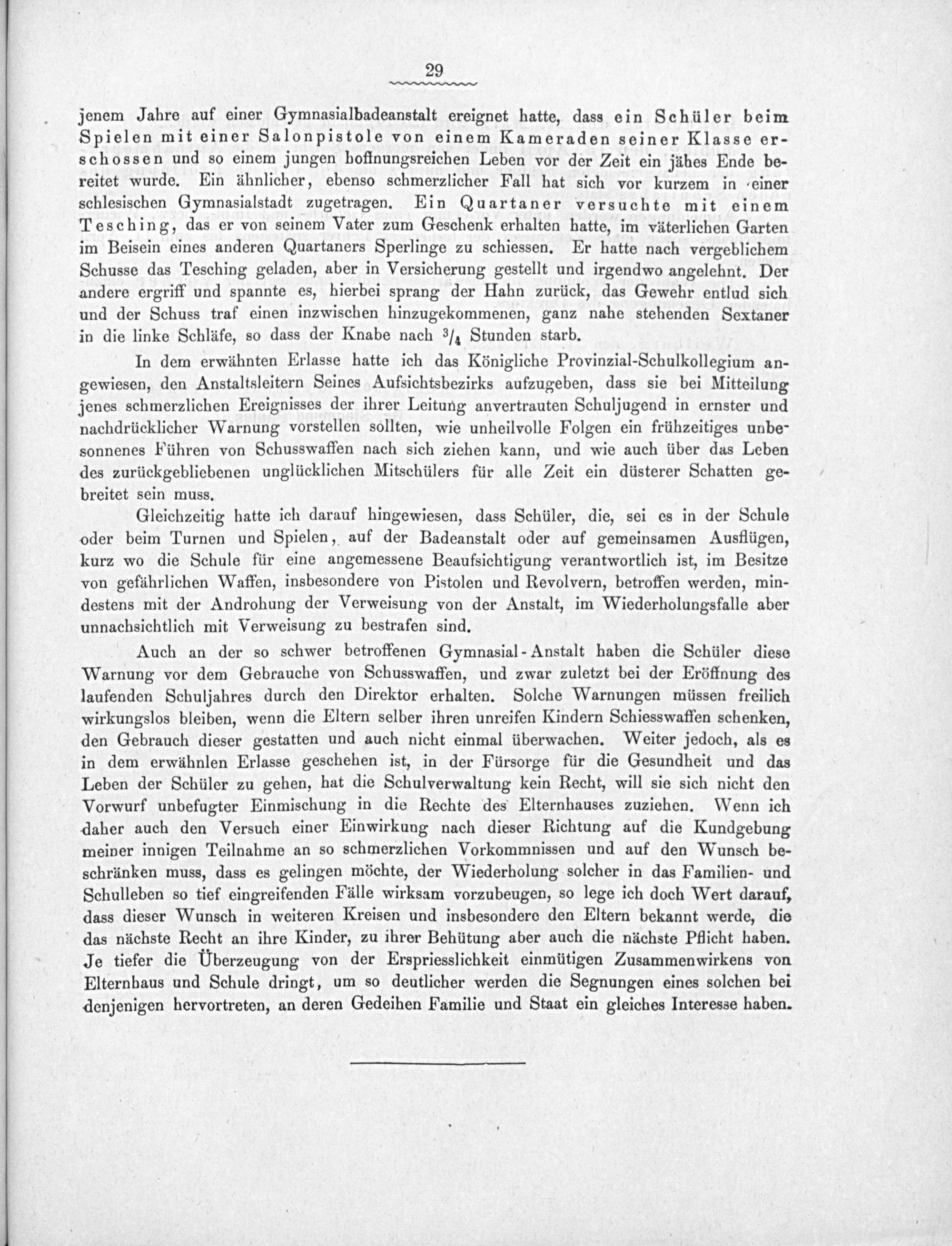 In dem erwähnten Erlasse hatte ich das Königliche Provinzial-Schulkollegium an- gewiesen, den Anstaltsleitern Seines Aufsichtsbezirks aufzugeben, dass sie bei Mitteilung jenes schmerzlichen Ereignisses der ihrer Leitung anvertrauten Schuljugend in ernster und nachdrücklicher Warnung vorstellen sollten, wie unheilvolle Folgen ein frühzeitiges unbe- sonnenes Führen von Schusswaffen nach sich ziehen kann, und wie auch über das Leben des zurückgebliebenen unglücklichen Mitschülers für alle Zeit ein düsterer Schatten ge- breitet sein muss.