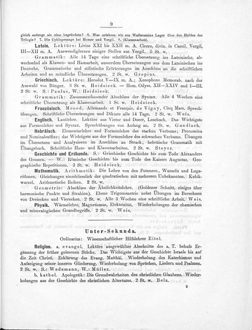 Grammatik: Alle 14 Tage eine schriftliche UÜbersetzung ins Lateinische, ab- wechselnd als Klassen- und Hausarbeit, ausserdem UÜbersetzungen aus dem Lateinischen ins Deutsche. Grammatische und stilistische Erörterungen im Anschluss an die schriftlichen Arbeiten und an mündliche Ubersetzungen. 2 St. w. Gropius.