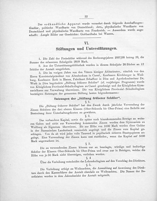 Das vorhandene Kapital, sowie die später noch hinzukommenden Beträge an weite- ren Gaben und nicht zur Verwendung kommenden Zinsen werden dem Gymnasium zu Weilburg als Eigentum überwiesen. Bis zur Höhe von 1000 Mark werden diese Gelder in der Nassauischen Landesbank verzinslich angelegt und die Zinsen zum Kapital ge- schlagen. Von da ab wird jedes volle Tausend in pupillarisch sicheren Staatspapieren an- gelegt. Eine Verwendung der Zinsen kann erst stattfinden, wenn das Kapital auf 5000 Mark angewachsen ist.