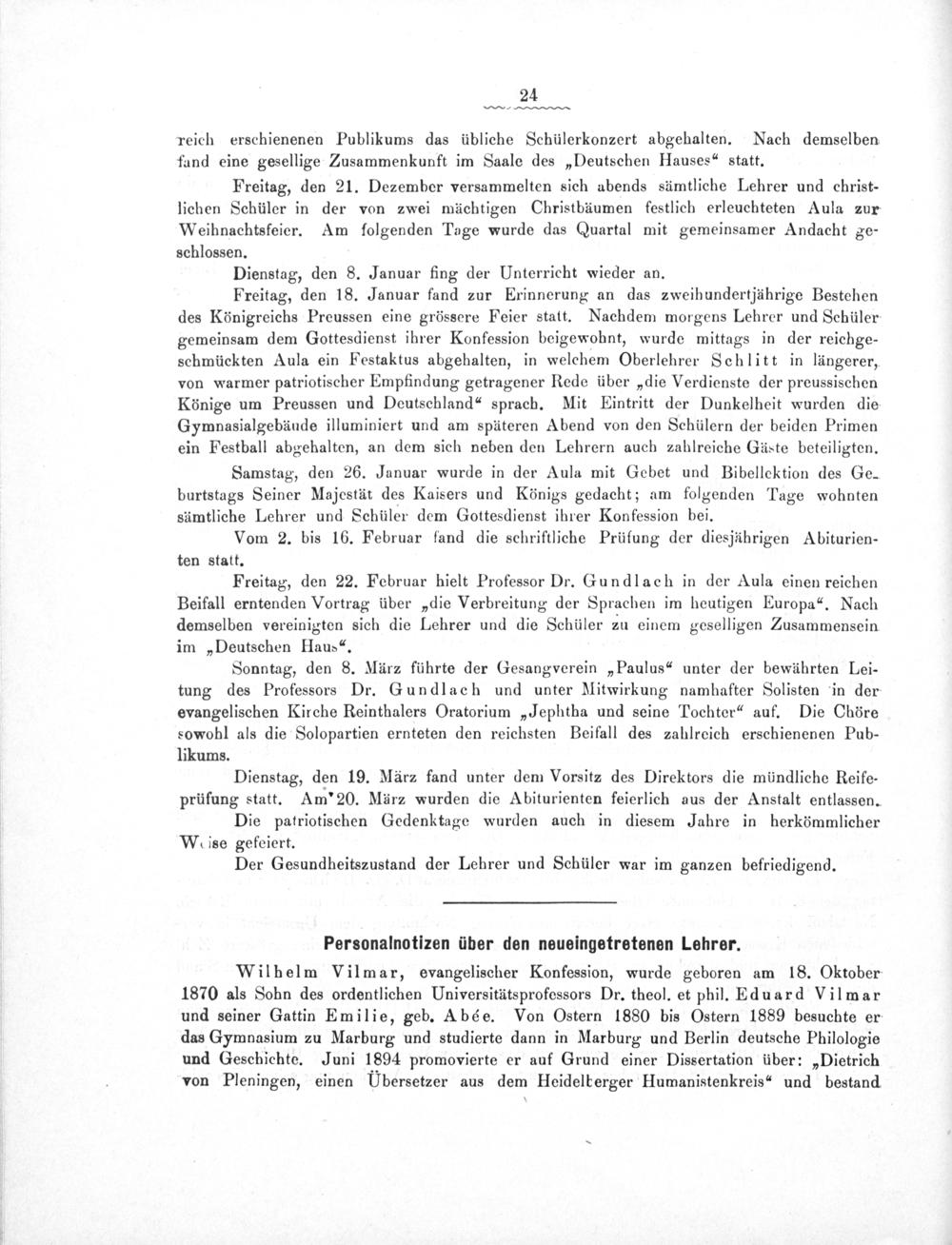 Wilhelm Vilmar, evvangelischer Konfession, wurde geboren am 18. Oktober 1870 als Sohn des ordentlichen Universitätsprofessors Dr. theol. et phil. Eduard Vilmar und seiner Gattin Emilie, geb. Abée. Von Ostern 1880 bis Ostern 1889 besuchte er das Gymnasium zu Marburg und studierte dann in Marburg und Berlin deutsche Philologie und Geschichte. Juni 1894 promovierte er auf Grund einer Dissertation über:„Dietrich von Pleningen, einen Übersetzer aus dem Heidelberger Humanistenkreis“ und bestand