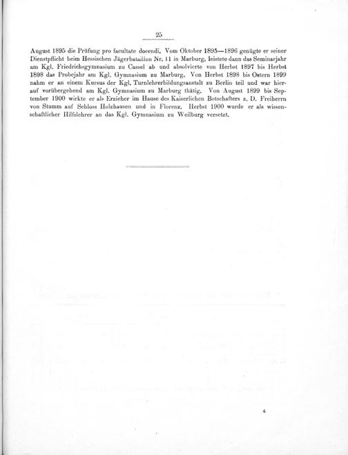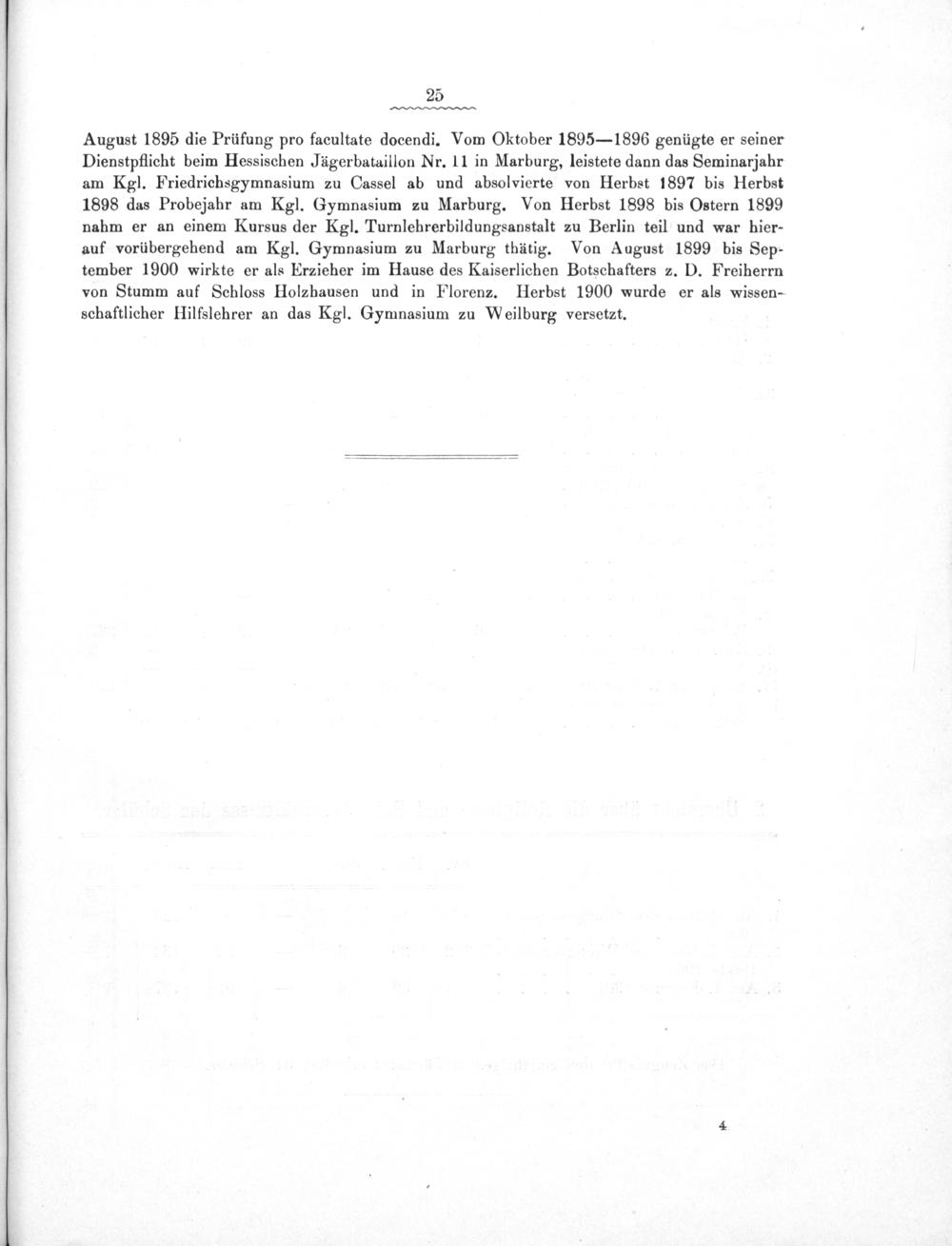 August 1895 die Prüfung pro facultate docendi. Vom Oktober 1895— 1896 genügte er seiner Dienstpflicht beim Hessischen Jägerbataillon Nr. 11 in Marburg, leistete dann das Seminarjahr am Kgl. Friedrichsgymnasium zu Cassel ab und absolvierte von Herbst 1897 bis Herbst 1898 das Probejahr am Kgl. Gymnasium zu Marburg. Von Herbst 1898 bis Ostern 1899 nahm er an einem Kursus der Kgl. Turnlehrerbildungsanstalt zu Berlin teil und war hier- auf vorübergehend am Kgl. Gymnasium zu Marburg thätig. Von August 1899 bis Sep- tember 1900 wirkte er als Erzieher im Hause des Kaiserlichen Botschafters z. D. Freiherrn von Stumm auf Schloss Holzhausen und in Florenz. Herbst 1900 wurde er als wissen- schaftlicher Hilfslehrer an das Kgl. Gymnasium zu Weilburg versetzt.