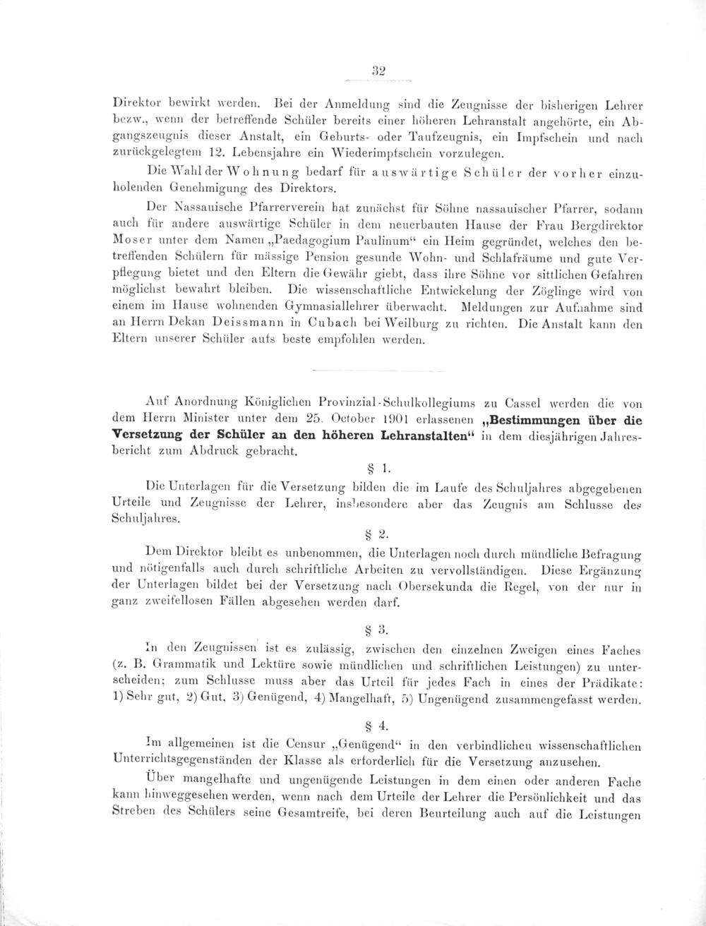 Auf Anordnung Königlichen Provinzial-Schulkollegiums zu Cassel werden die von dem Herrn Minister unter dem 25. October 1901 erlassenen„Bestimmungen über die Versetzung der Schüler an den höheren Lehranstalten“ in dem diesjährigen Jahres- bericht zum Abdruck gebracht.