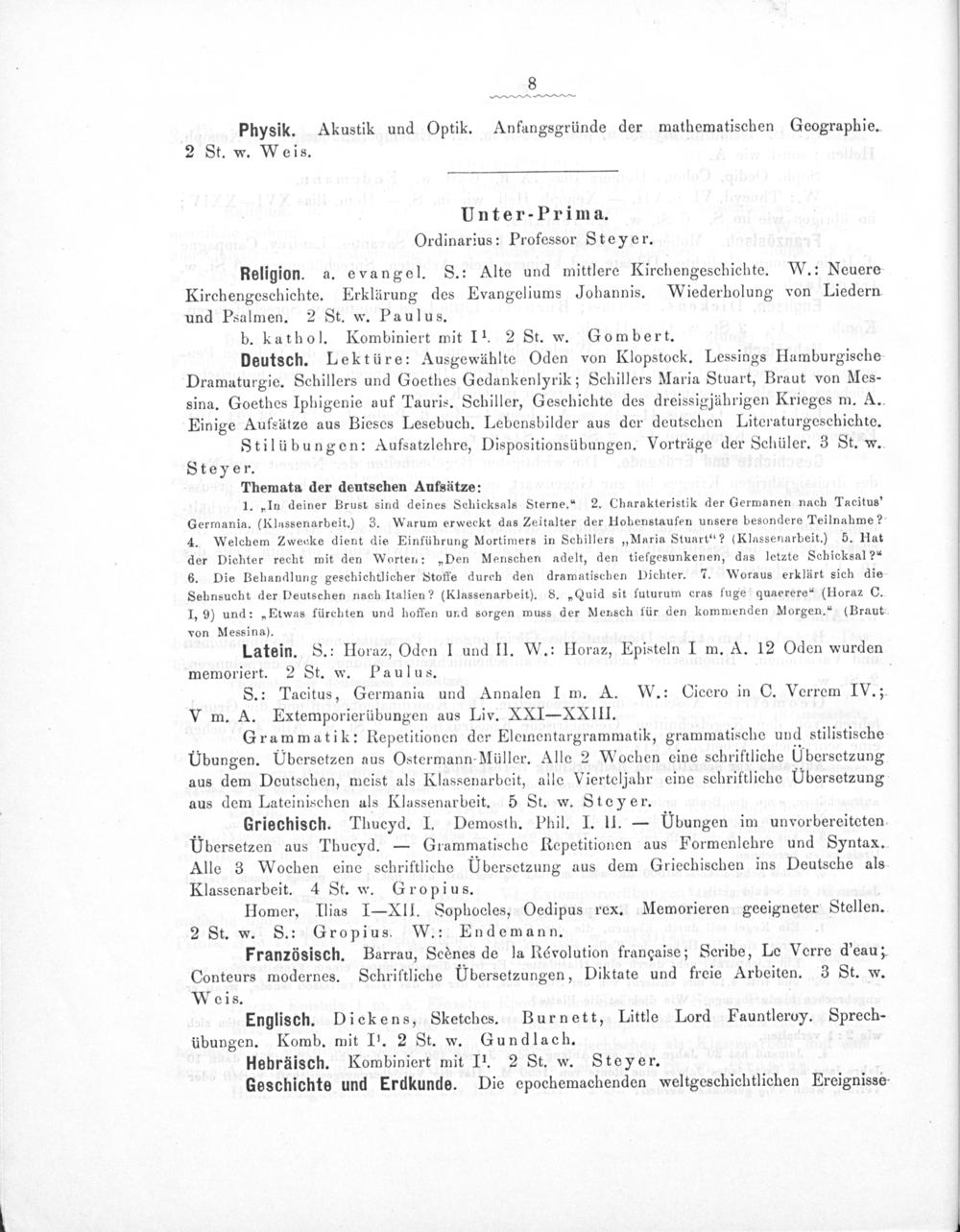 Religion. a. evangel. S.: Alte und mittlere Kirchengeschichte. W.: Neuere Kirchengeschichte. Erklärung des Evangeliums Johannis. Wiederholung von Liedern und Psalmen. 2 St. w. Paulus.