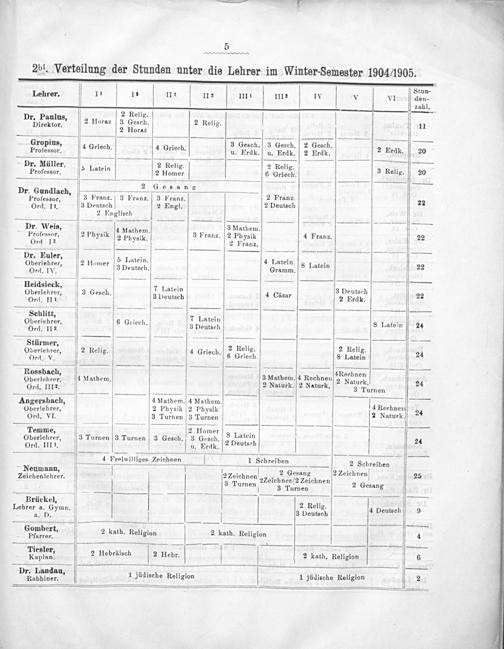 — 4— Lehrer. 1¹ 1 ²³ II 1¹ II ² III ¹ III ² IV N VI den- zahl. 2 Relig. Dr. Paulus 5 3 Direktor., 2 Horaz 3 Gesch. 2 Relig. V 11 2 Horaz Gropius, 4.. 3 Gesch. 3 Gesch. 2 Gesch.— Prosbagor, 4 Griech. 4 Griech. u. Erdk. u. Erdk. 2 Erdk. 2 Erdk. 20 Dr. Müller, 2 Relig. 2 Relig.. Professor. 5 Laatein 2 Homer 6 Griech. 3 Relig. 2⁰ 2 Gesan— Dr. Gundlach,—— 3 Professor, 3 Franz. 3 Franz. 3 Franz. 2 Franz. 22 Ord. I. 3 Deutsch 2 Engl. 2 Deutsch 2 Englisch Dr. Weis 3 Mathem. F 5 Profesaor, 2 Physik tlchem. 3 Franz. 2 Physik 4 Franz. 22 Ord 12 vee⸗ 2 Franz. Dr. Euler.— 5 4„: 4— Oberiehrer, 2 Homer Ftcit, 4 Latein. 8 Latein 22 Ord. IV. eutsch. Gramm. Heidsieck, 3 7. Latein 8 3 Deutsch GWenenrn 3 Gesch. 3 Deutsch 4 Cäsar 2 Erdhk. 22 Schlitt, Oberlehror, 6 Griech. 7 Uatein 8 Latein 24 Ord. 112. 3 Deutsch Stürmer,— 8—: ; zeeh 2 RKelig. 2 Relig. Obenehrer. 2 Kelis. 4 Grieoh. 6 Griech. 8 Latein 24 Rossbach„Rechnen Oberiehrer, 4 Matbem. 3 Mathem. 4 Rechnen 2 Naturk. 24 Ord. III2. 2 Naturk. 2 Naturk. 3 Turnen Angersbach 4 Mathem. 4 Mathem.—— Oberiehrer, 2 Physik 2 Physik 4Keehnen 24 Ord. VI. 3 Turnen 3 Turnen aturk. Temme— 3 2 Homer.—— Oberlehrer, 3 Turnen 3 Turnen 3 Gesch. 3 Gesch. Srlite 24 Ord. III. u. Pedk.] 2 Deutse V 8 4 Freiwilliges Zeichnen 1 Schreiben 2 Schreiben Neumann, 2 Gesan 2 Zeich 27: sang eichnen 25 Zeichenlebrer. Leſehnen 2Zeichnenſ2 Zeichnen 2 G 3 Turnen Lsang Brückel, 1 2 Relig. Lere irymn. V 3 Peutsch 4 Deutsch 9 Gonbert. 2 kath. Religion 2 kath. Religion 4 Tiesler, 2 Hebräisch 2 Nd 2 kath. Religion 6 Kaplan.. Religio Dr. Landau, ¹ jüdische Religion 1 jüdische Religion 2