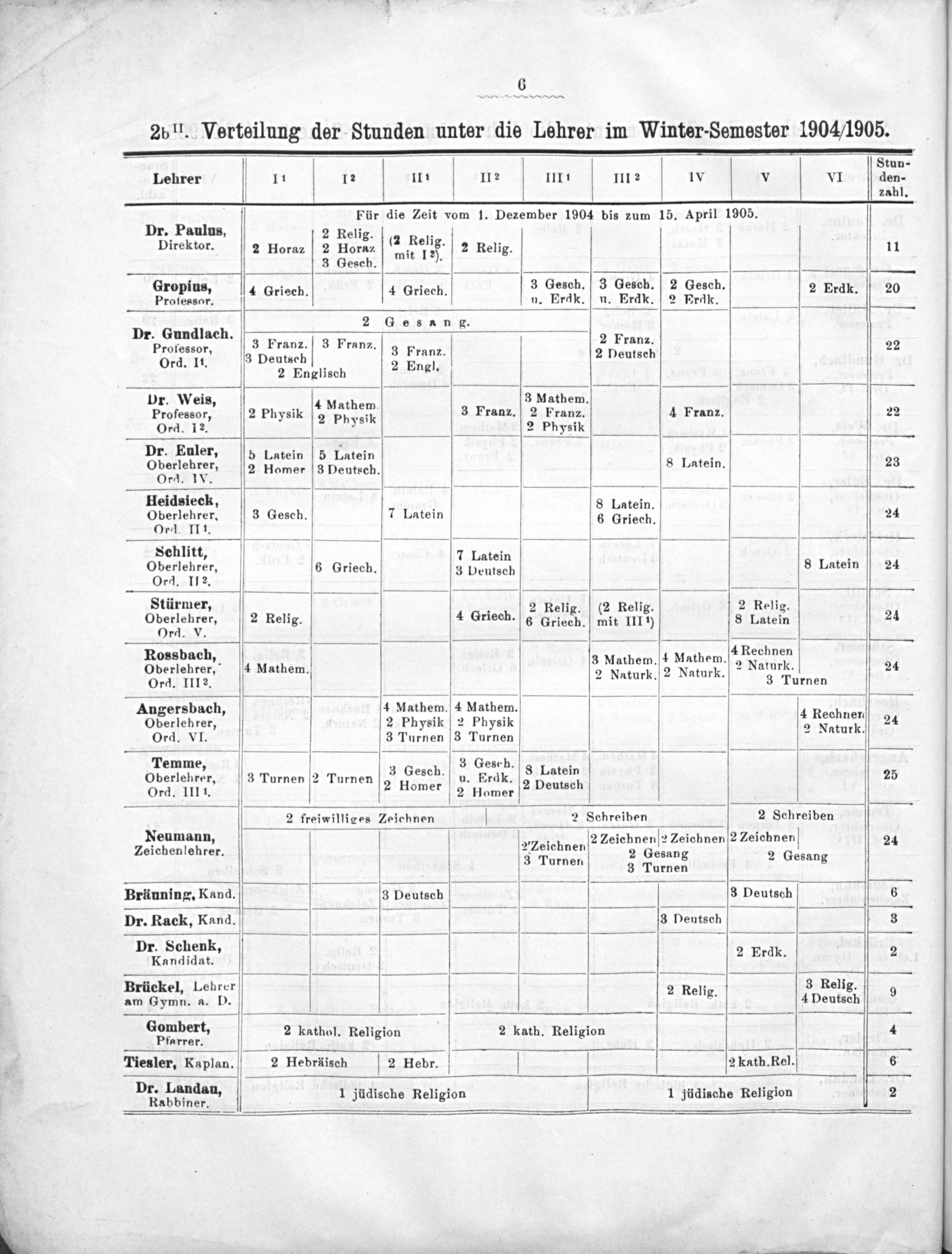 Lehrer 1¹ 1² 111 II ² III1 III ² IV V VI den- zahl. Für die Zeit vom 1. Dezember 1904 bis zum 15. April 1905. Dr. Paulus, 2 Reli . g.. Direktor. 2 Horaz 2 Hora⸗(2 Relig. 2 Relig. 11 3 Gesch. mit 12). Gropius 3 Gesch. 3 Gesch. 2 Gesch. 2 Erdk 2 Proleasar. 4 Gelzeh. 4deh. n. Erdk. u. Erdk. 2 rdk. au⸗ 9 2 Gesang. Dr. Gundlach. Professor, 3 Pranz. 3 Franz. 3 Pranz. 2iLendee 22 Ord. Ii. 3 Deutsch 2 Engl eutse 2 Englisch gl. Dr. Weis 3 Mathem. Professor, 2 Physik tMeiheae 3 Franz. 2 Pranz. 4 Franz. 22 Ord. 12.* 2 Physik Dr. Euler, 5 Latein 5 Latein Oberlehrer, 2 Homer 3 Deutsch. 8 Latein. 2³ Ord. IV. Heidsieck 3 Oberlehrer. 3 Gesch. 7 Latein reein, 24 Ord. II1. Oberlehrer, 6 Griech. 3 Lrean, 8 Latein 24 Ord. II2.— Stürmer, 2 Relig.(2 Reli 2 Reli —. g. elig. Obesiehree, 2 Relig. 4 Griech. 6 Grieah. 624 111¹) 8 Latein 24 rd.. Rossbach 4 Mathem. 4 Rechnen Oberlehrer, 4 Mathem. dlerbei. 2 Ne. 2 Naturk. 24 Ord. III2. 2 Daeur. 4 3 Turnen Angersbach 4 Mathem. 4 Mathem. 5 Oberlehrer, 3 2 Physik 2 Physik 4 echnen 24 Ord. VI. 3 Turnen 3 Turnen Naturk) Temme,. 3 Gesch.— Oberlehrer, 3 Turnen 2 Turnen 2 Gesch. u. Erdk. Säl.iein. 25 Ord. III¹. omer 2 Homer 2 Deutsc 2 freiwilliges Zeichnen 2 Schreiben 2 Schreiben Neumann, 2 Zeichnen 2 Zeichnen 2 Zeichnen 2 7 5: 2n2 4 Zeichenlehrer. 2 Zeichnen rer 3 Turnen 4 Hesnog 2 Gesang Bräuning., Kand. 3 Deutsch 3 Deutsch 6 Dr. Rack, Kand. 3 Deutsch 3 Dr. Schenk Kandidat. 3 2 Erdk. 2 Brückel, Lebrer; 3 Relig. am Gymn. a. D. 2 Relig. 4 Deutsch 9 Gombert, 2 kathol. Religion 2 kath. Religion 4 Pfarrer. — Tiesler, Kaplan. 2 Hebräisch 2 Hebr. 2 kath. Rel. 6 Dr. L..5 651 1. Landan. 1 jüdische Religion 1 jüdische Religion 2