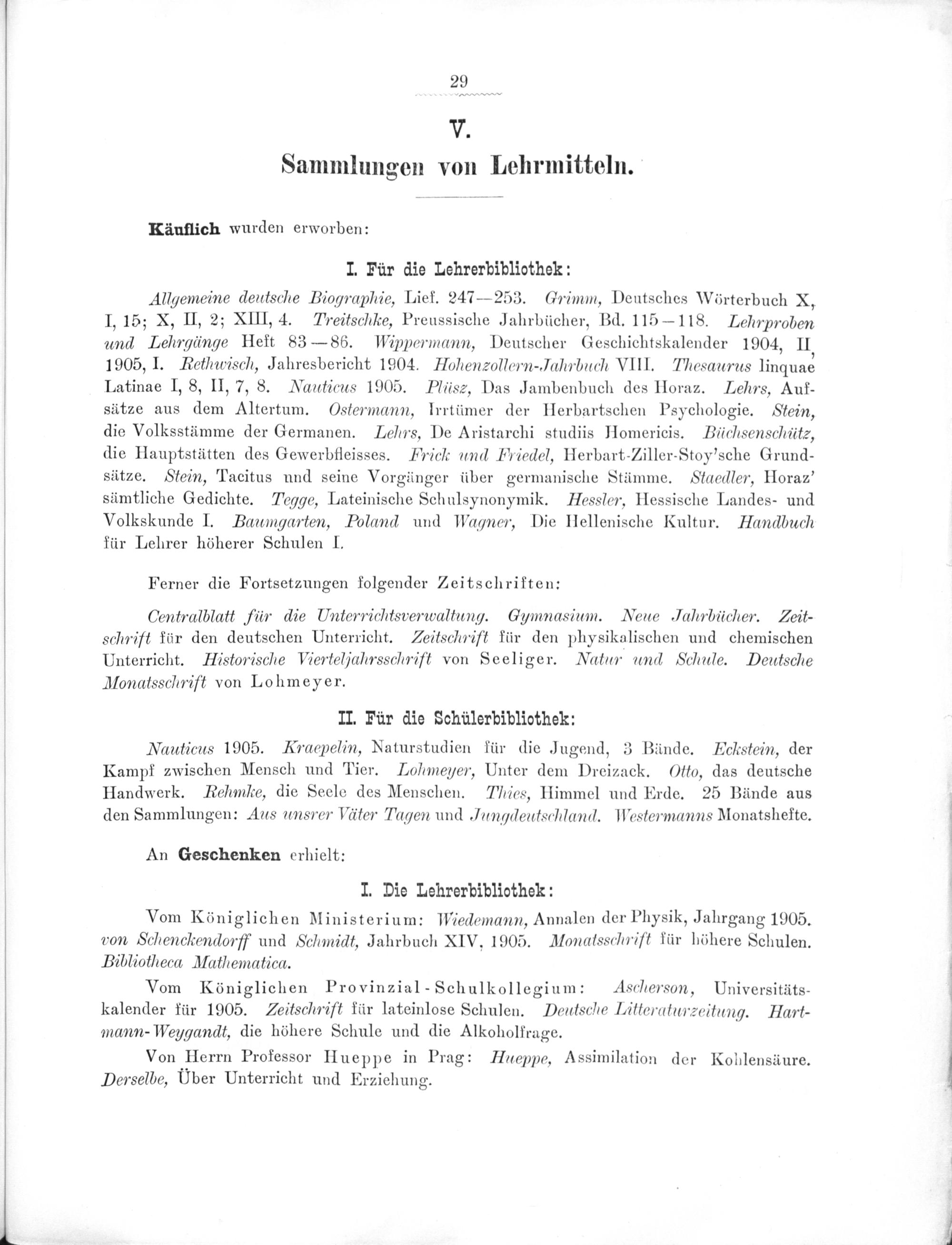 Vom Königlichen Ministerium: WViedemann, Annalen der Physik, Jahrgang 1905. von Schenckendorff und Schmidt, Jahrbuch XIV. 1905. Monatsschrift für höhere Schulen. Bibliotheca Mathematica.