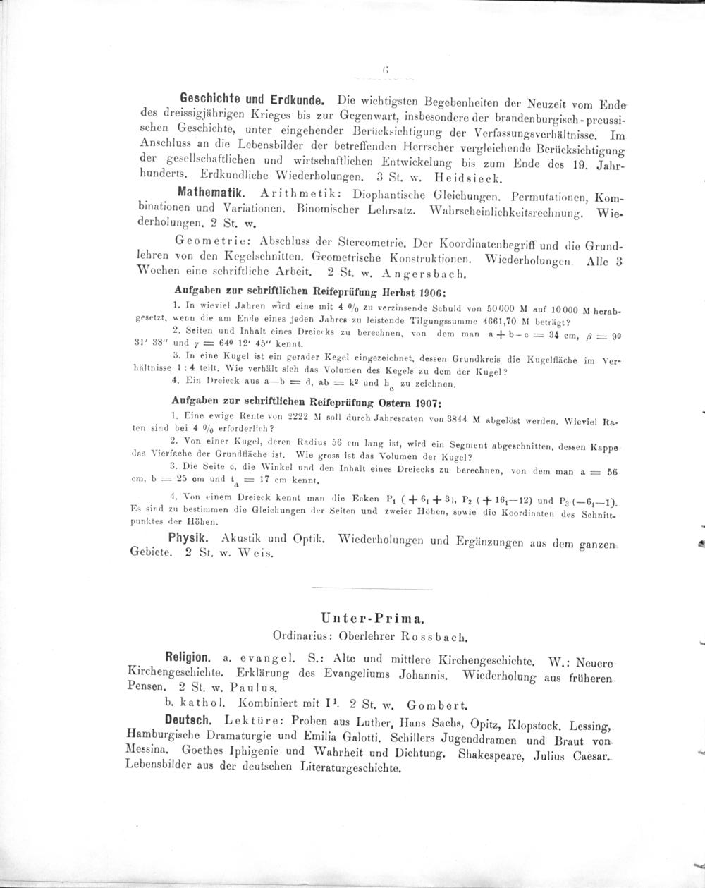 Geometrie: Abschluss der Stereometrie. Der Koordinatenbegriff und die Grund- lehren von den Kegelschnitten. Geometrische Konstruktionen. Wiederbolungen. Alle 3 Wochen eine schriftliche Arbeit. 2 St. w. Angersbach.