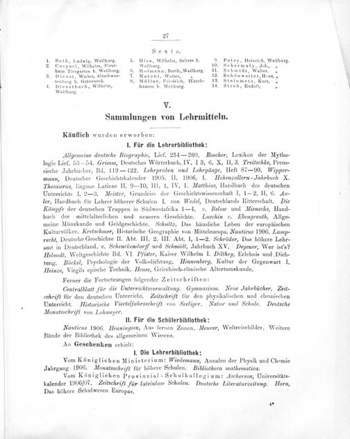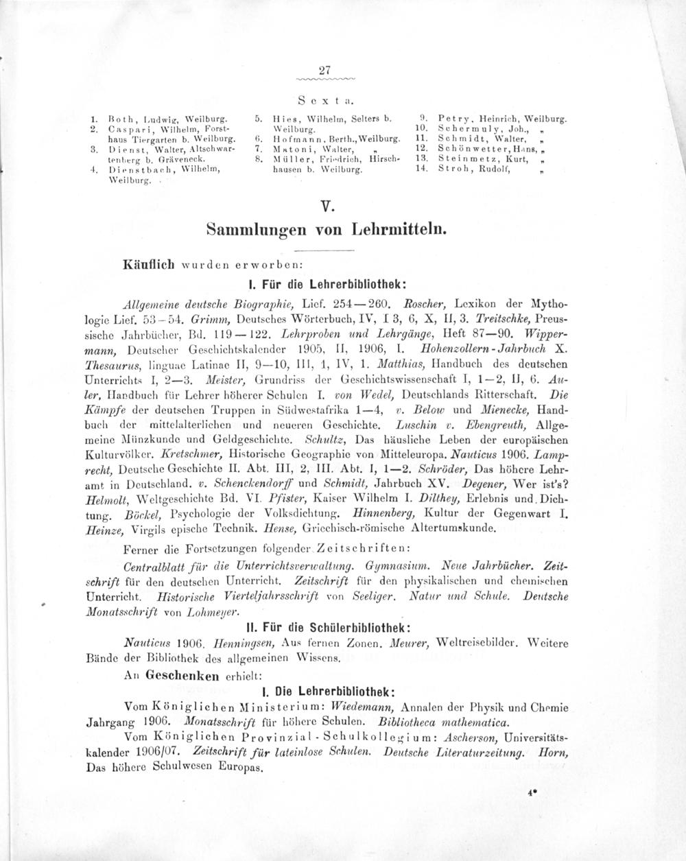 Allgemeine deutsche Biographie, Lief. 254— 260. Roscher, Lexikon der Mytho- logie Lief. 53— 54. Grimm, Deutsches Wörterbuch, IV, I 3, 6, X, II, 3. Treitschke, Preus- sische Jahrbücher, Bd. 119— 122. Lehrproben und Lehrgänge, Heft 87— 90. Wipper- mann, Deutscher Geschichtskalender 1905, II, 1906, I. Hokenzollern-Jahrbuch X. Thesaurus, linguae Latinae II, 9— 10, III, 1, IV, 1. Matthias, Handbuch des deutschen Unterrichts I, 2— 3. Meister, Grundriss der Geschichtswissenschaft I, 1—2, II, 6. Au- ler, Handbuch für Lehrer höherer Schulen I. von Wedel, Deutschlands Ritterschaft. Die Kämpfe der deutschen Truppen in Südwestafrika 1— 4, p. Below und Mienecke, Hand- buch der mittelalterlichen und neueren Geschichte. Luschin o. Ebengreuth, Allge- meine Münzkunde und Geldgeschichte. Schulte, Das häusliche Leben der europäischen Kulturvölker. Kretschmer, Historische Geographie von Mitteleuropa. Nauticus 1906. Lamp- recht, Deutsche Geschichte II. Abt. III, 2, III. Abt. I, 1— 2. Schröder, Das höhere Lehr- amt in Dcutschland. v. Schenckendorff und Schmidt, Jahrbuch XV. Degener, Wer ist's? Helmolt, Weltgeschichte Bd. VI. Pfister, Kaiser Wilhelm I. Dilthey, Erlebnis und. Dich- tung. Böckel, Psychologie der Volksdichtung. Hinnenberg, Kultur der Gegenwart I. Heinæe, Virgils epische Technik. Hense, Griechisch-römische Altertumskunde.