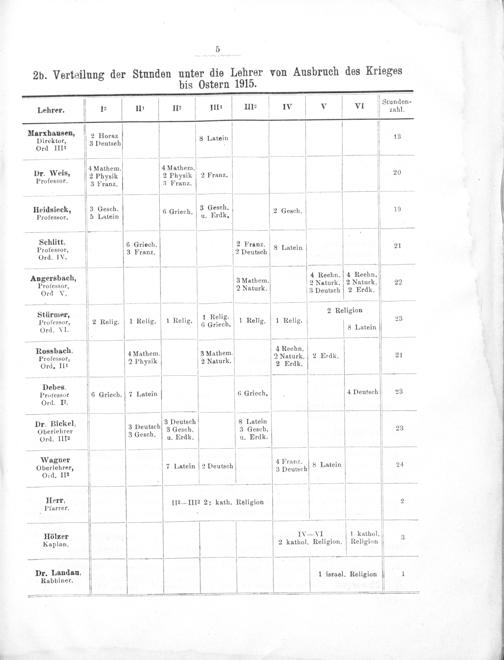 2b. Verteilung der Stunden unter die Lehrer von Ausbruch des Krieges bis Ostern 1915.