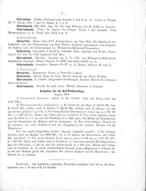 Oberprima. Homer Ilias XVI. Extemporieren aus Xen. Hell. Die Spürhunde des Sophokles nach der Uebersetzung von Karl Robert. Aeschylos Agamemnon und Euripides der Kyklop nach der Uebersetzung von Wilamowitz-Möllendorff besprochen.