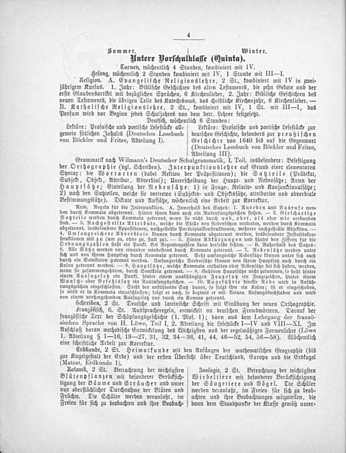 Grammatik nach Wilmann's Deutscher Schulgrammatik, I. Teil, insbeſondere: Befeſtigung der Orthographie(vbgl. Schreiben). Interpunktionslehre auf Grund einer elementaren Syntax: die Wortarten(dabei Rektion der Präpoſitionen); die Satzteile(Prädikat, Subjekt, Objekt, Attribut, Adverbial); Unterſcheidung der Haupt⸗ und Nebenſätze; Arten der Hauptſätze; Einteilung der Nebenſätze: 1) in Frage⸗, Relativ⸗ und Konjunktionalſätze; 2) nach den Satzteilen, welche ſie vertreten(Subjekts⸗ und Objektsſätze, attributive und adverbiale Beſtimmungsſätze). Diktate und Aufſätze, wöchentlich eine Arbeit zur Korrektur.