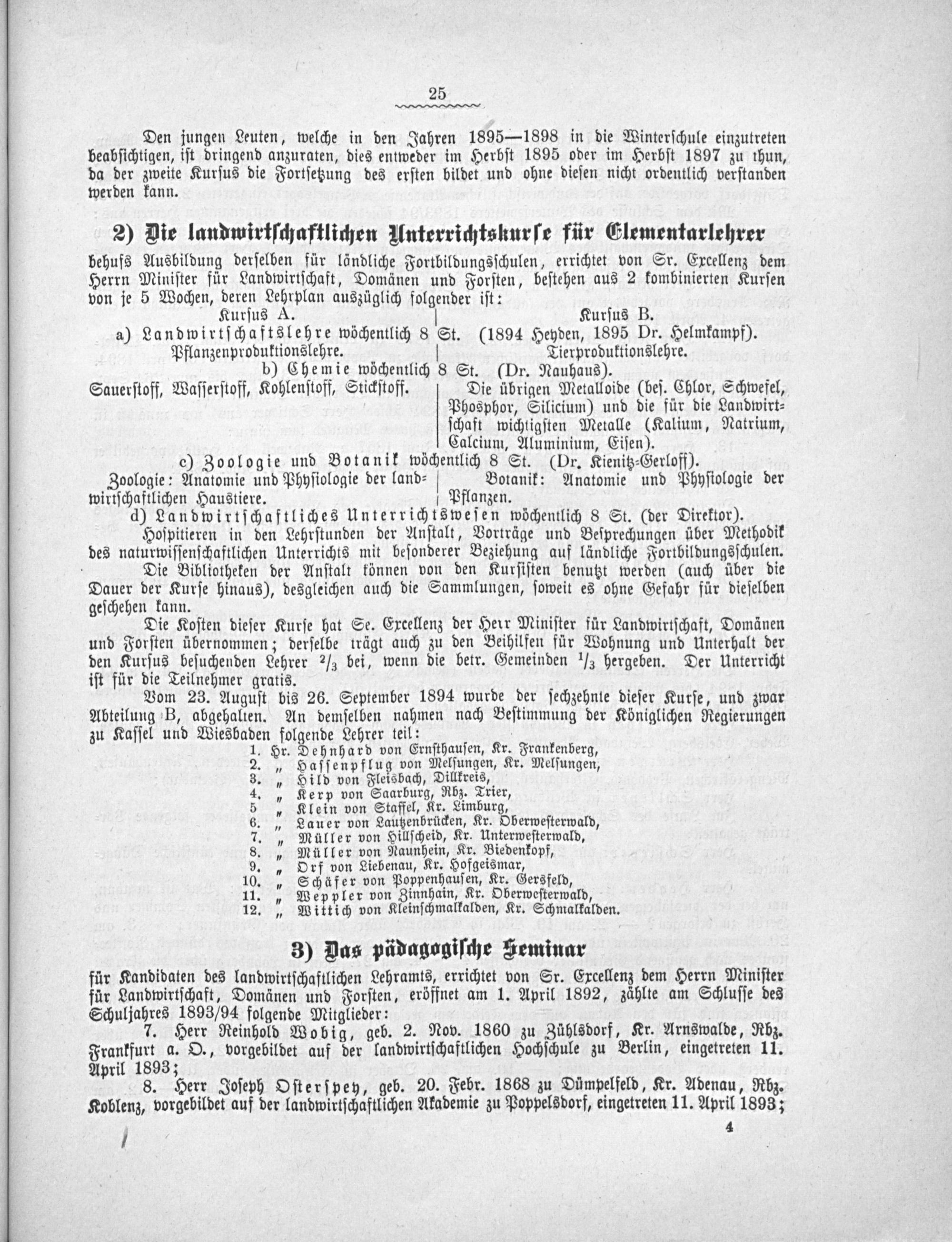 Kurſus A. Kurſus B. a) Landwirtſchaftslehre wöchentlich 8 St.(1894 Heyden, 1895 Dr. Helmkampf). Pflanzenproduktionslehre. Tierproduktionslehre. b) Chemie wöchentlich 8 St.(Dr. Nauhaus).
