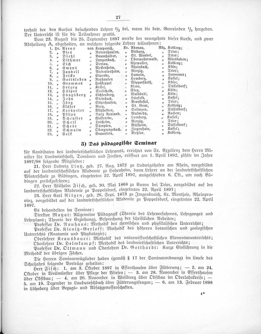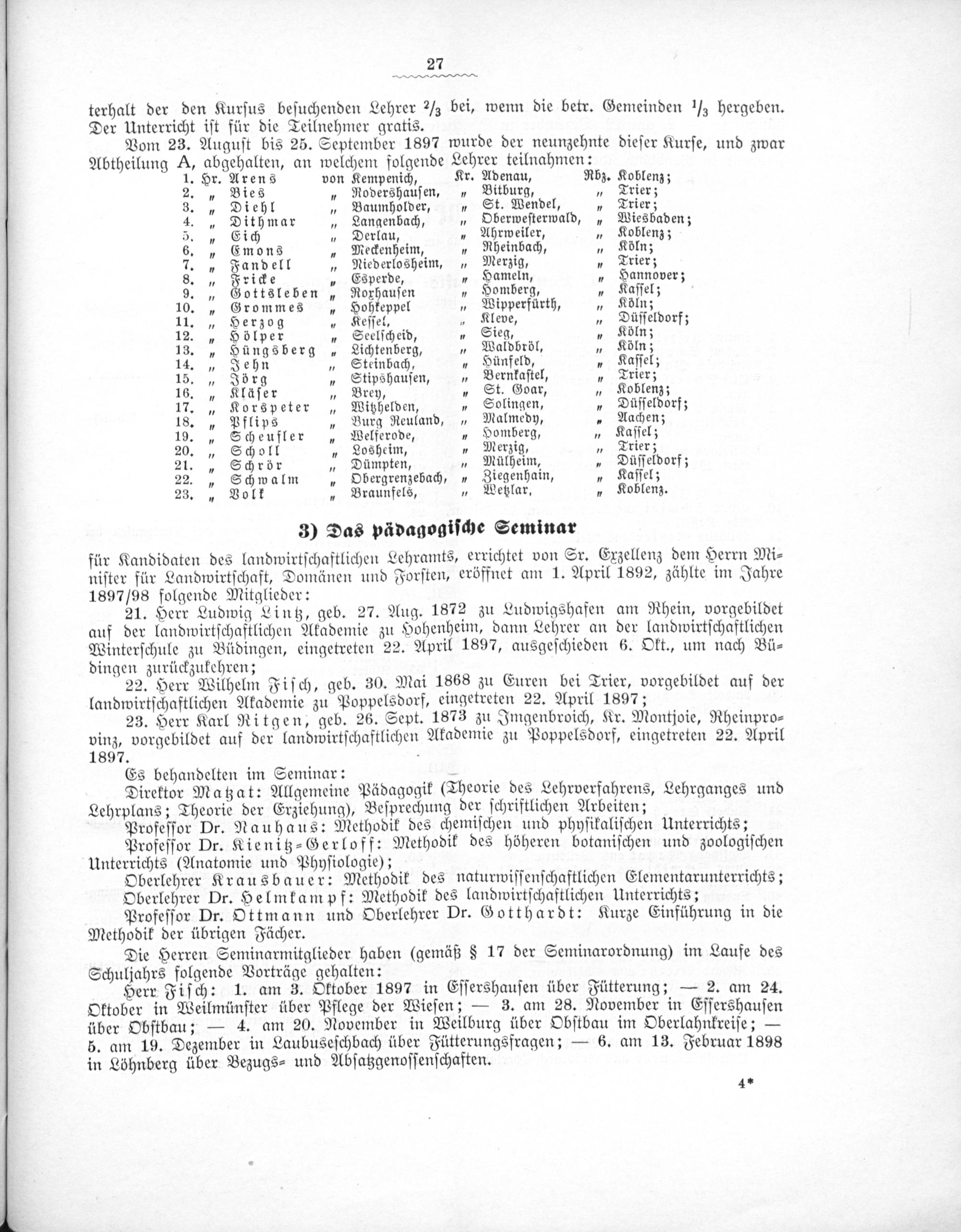 terhalt der den Kurſus beſuchenden Lehrer ⅓ bei, wenn die betr. Gemeinden h hergeben. Der Unterricht iſt für die Teilnehmer gratis. Vom 23. Auguſt bis 25. September 1897 wurde der neunzehnte dieſer Kurſe, und zwar Abtheilung A, aüdebalden, an welchem folgende Lehrer teilnahmen: 1. Hr.