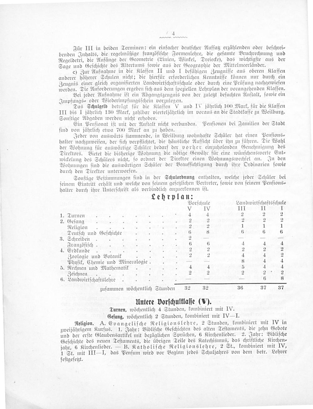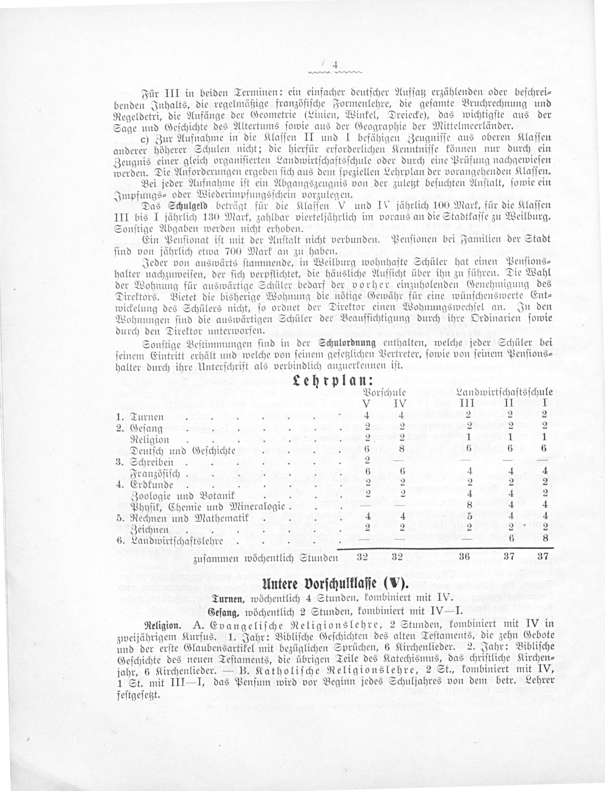 Das Schulgeld beträgt für die Klaſſen V und I jährlich 100 Mark, für die Klaſſen III bis I jährlich 130 Mark, zahlbar vierteljährlich im voraus an die Stadtkaſſe zu Weilburg. Sonſtige Abgaben werden nicht erhoben.