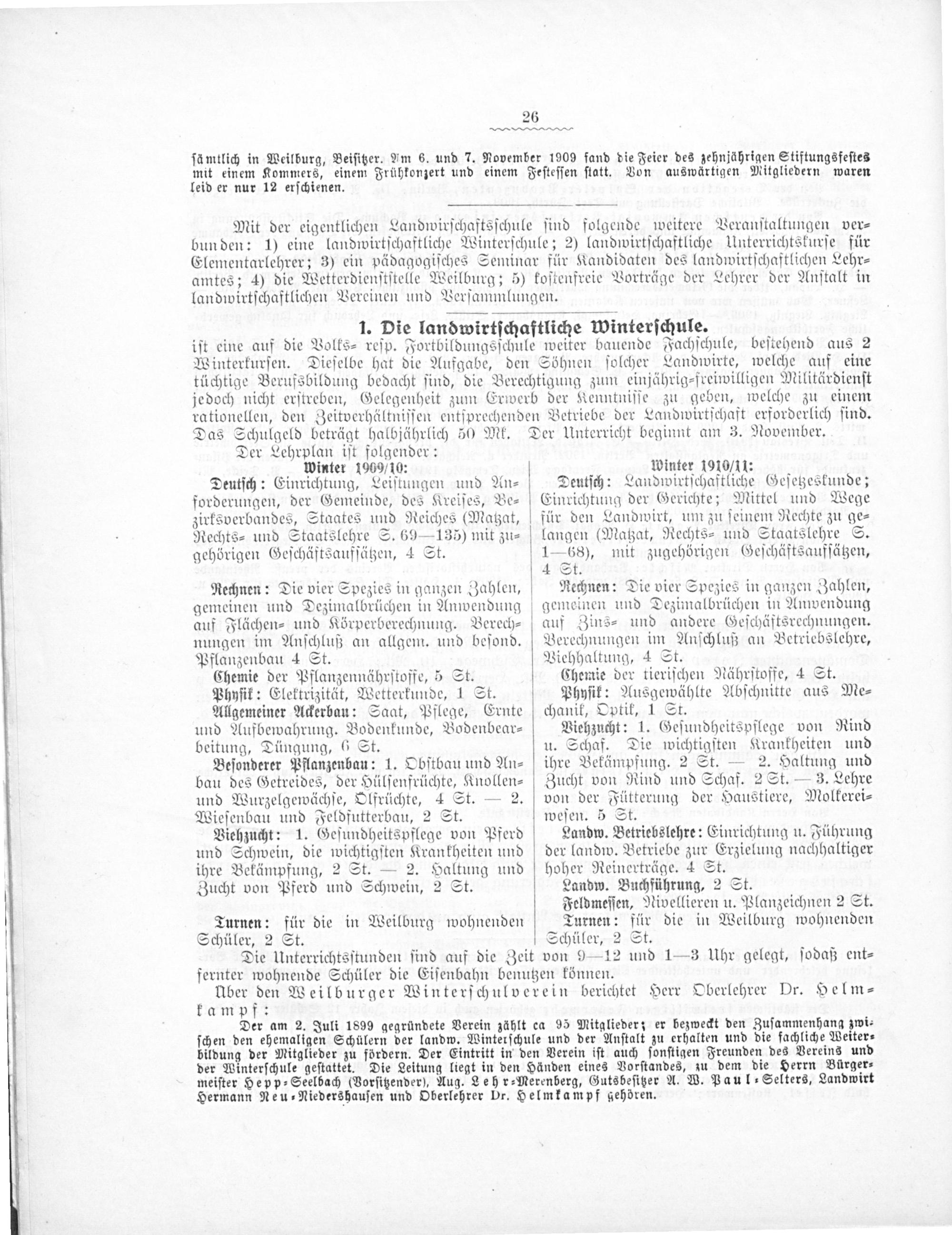 1. Die landwirtſchaftliche Winterſchule. iſt eine auf die Volks⸗ reſp. Fortbildungsſchule weiter bauende Fachſchule, beſtehend aus 2 Winterkurſen. Dieſelbe hat die Aufgabe, den Söhnen ſolcher Landwirte, welche auf eine tüchtige Berufsbildung bedacht ſind, die Berechtigung zum einjährig⸗freiwilligen Militärdienſt jedoch nicht erſtreben, Gelegenheit zum Erwerb der Kenntniſſe zu geben, welche zu einem rationellen, den Zeitverhältniſſen entſprechenden Betriebe der Landwirtſchaft erforderlich ſind. Das Schulgeld beträgt halbjährlich 50 Mk. Der Unterricht beginnt am 3. November. Der Lehrplan iſt folgender: Winter 1900/10: Deutſch: Einrichtung, Leiſtungen und An⸗