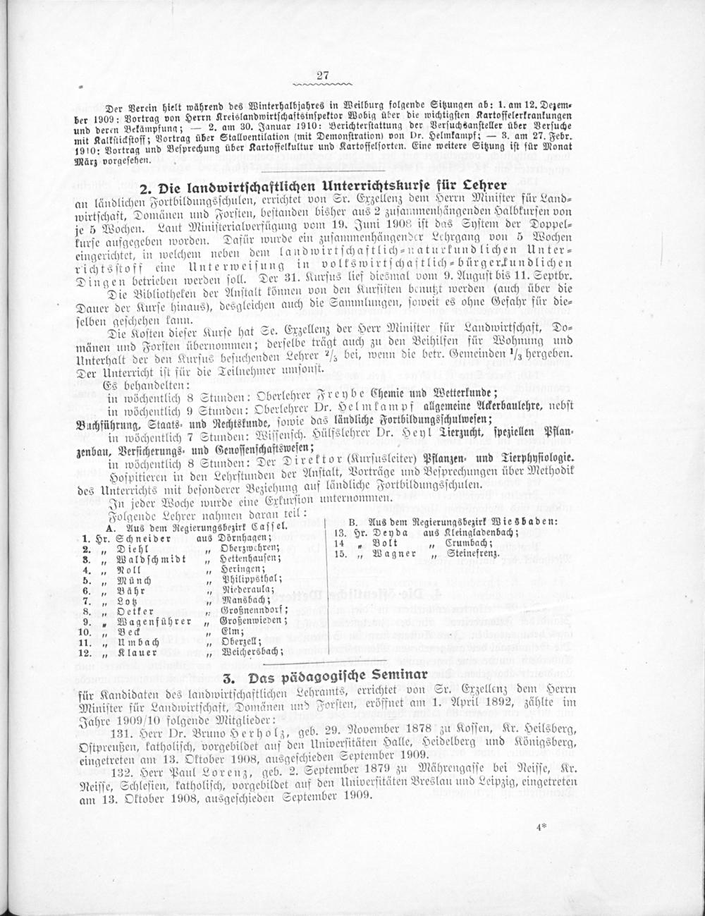 3. Das pädagogiſche Seminar für Kandidaten des landwirtſchaftlichen Lehramts, errichtet von Sr. Exzellenz dem Herrn Miniſter für Landwirtſchaft, Domänen und Forſten, eröffnet am 1. April 1892, zählte im Jahre 1909/10 folgende Mitglieder: