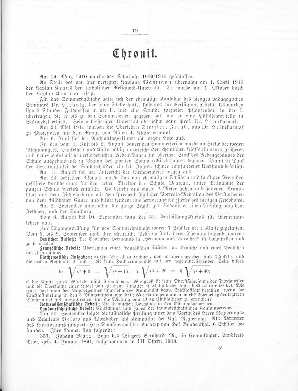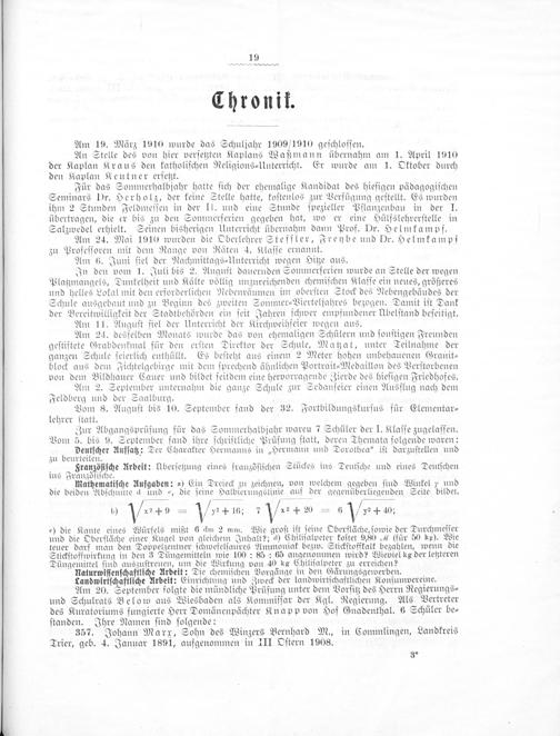 357. Johann Marx, Sohn des Winzers Bernhard M., in Commlingen, Landkreis Trier, geb. 4. Januar 1891, aufgenommen in III Oſtern 1908.