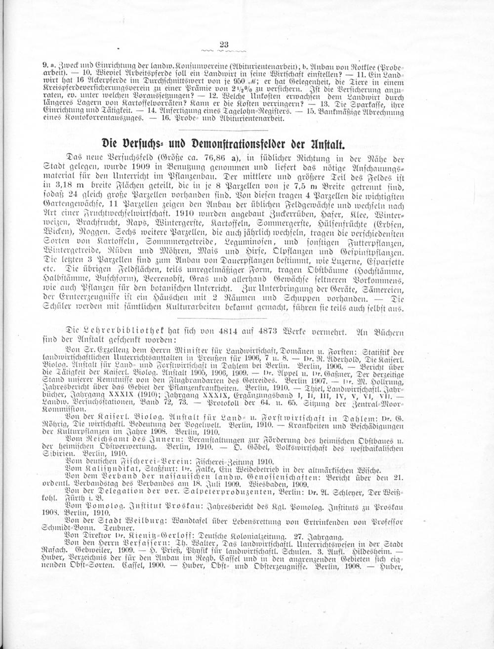 Das neue Verſuchsfeld(Größe ca. 76,86 a), in ſüdlicher Richtung in der Nähe der Stadt gelegen, wurde 1909 in Benutzung genommen und liefert das nötige Anſchauungs⸗ material für den Unterricht im Pflanzenbau. Der mittlere und größere Teil des Feldes iſt in 3,18 m breite Flächen geteilt, die in je 8 Parzellen von je 7,5 m Breite getrennt ſind, ſodaß 24 gleich große Parzellen vorhanden ſind. Von dieſen tragen 4 Parzellen die wichtigſten Gartengewächſe, 11 Parzellen zeigen den Anbau der üblichen Feldgewächſe und wechſeln nach Art einer Fruchtwechſelwirtſchaft. 1910 wurden angebaut Zuckerrüben, Hafer, Klee, Winter⸗