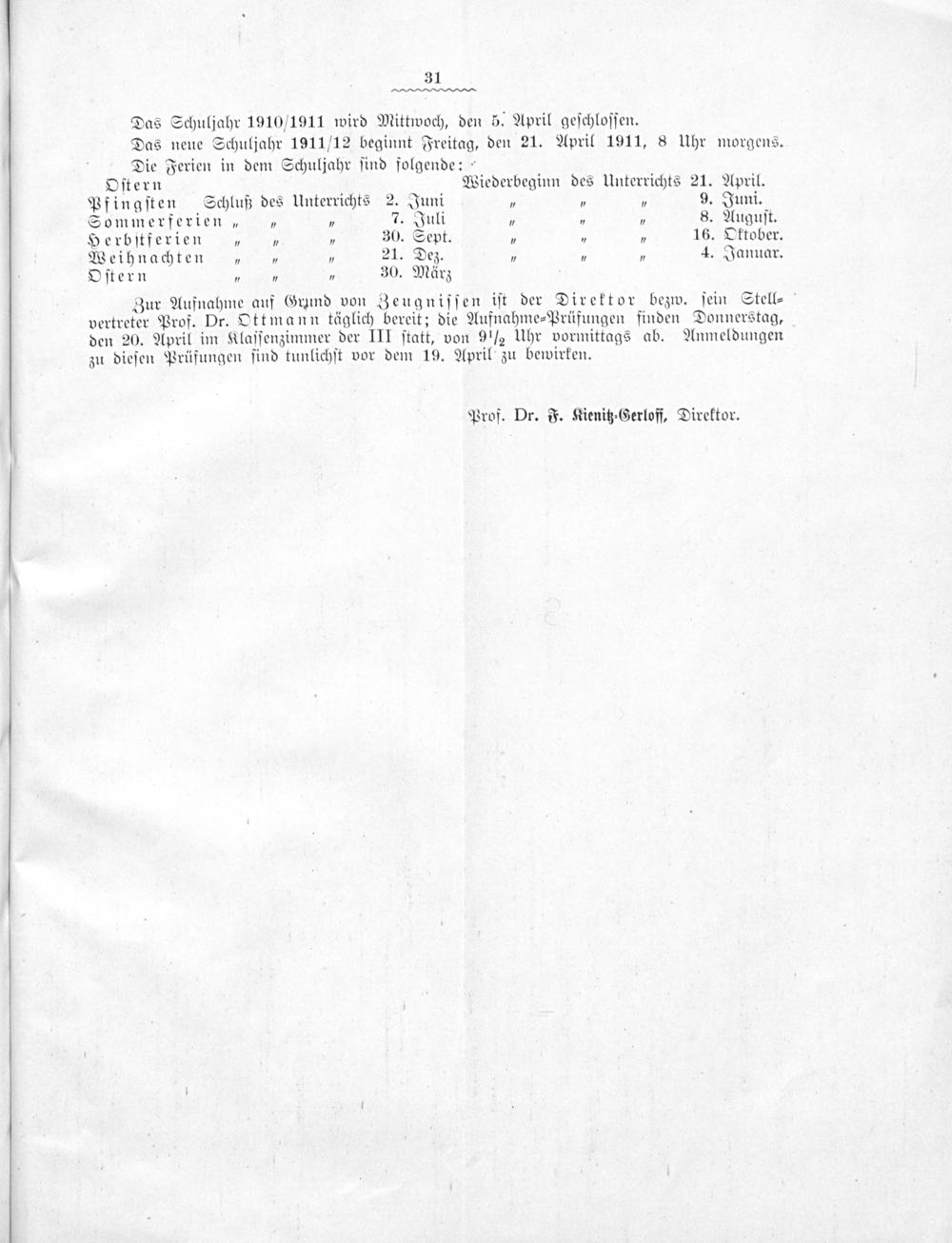 31 Das Schuljahr 1910/1911 wird Mittwoch, den 5. April geſchloſſen. Das neue Schuljahr 1911/12 beginnt Freitag, den 21. April 1911, 8 Uhr morgens. Die Ferien in dem Schuljahr ſind folgende:—