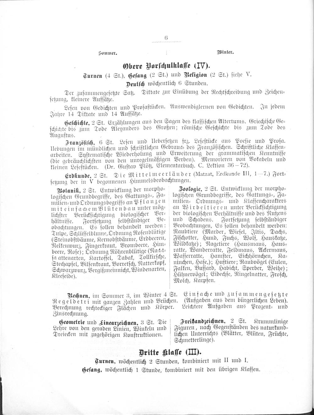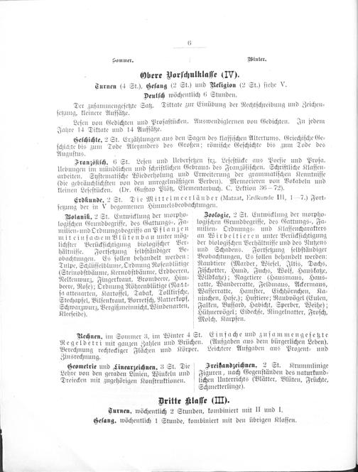 Obere Vorſchulklaſſe(IV). Turnen(4 St.), Geſang(2 St.) und Religion(2 St.) ſiehe V. Deutſch wöchentlich 6 Stunden.