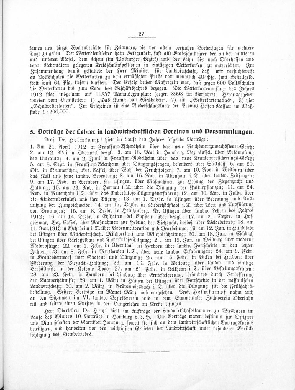1. Am 21. April 1912 in Frankfurt⸗Eſchersheim über das neue Reichswertzuwachsſteuer⸗Geſetz; 2. am 12. Mai in Oberurſel desgl.; 3. am 18. Mai in Homberg, Bez. Caſſel, über Bekämpfung des Unkrauts; 4. am 2, Juni in Frankfurt⸗Rödelheim über das neue Krankenverſicherungs⸗Geſetz; 5. am 8. Sept. in Frankſurt⸗Eckenheim über Düngnngsfragen, beſonders über Stickſtoff; 6. am 20. Okt. in Neumorſchen, Bez. Caſſel, über Wahl der Fruchtfolgen; 7. am 10. Nov. in Weilburg über das Kali und ſeine landw. Bedeutung; 8. am 16. Nov. in Altenhain i. T. über landw. Zeitfragen; 9. am 17. Nov. in Wernborn, Kr. Uſingen, über Maßnahmen zur Hebung der Ziegenzucht und Haltung; 10. am 23. Nov. in Hornau i. T. über die Düngung der Kulturpflanzen; 11. am 24. Nov. in Neuenhain i. T. über das Tuberkuloſe⸗Tilgungsverfahren; 12. am 30. Nov. in Fulda über die Rindertuberkuloſe und ihre Tilgung; 13. am 1. Dezbr. in Uſingen über Bedeutung und Aus⸗ untzung der Jungviehweide; 14. am 17. Dezbr. in Niederhöchſtadt i. T. über Wert und Ausführung von Drainagen; 15. am 8. Dezbr. in Heinzenberg, Kr. Uſingen über landw. Lehren des Jahres 1912; 16. am 14. Dezbr. in Ehlhalten bei Eppſtein üder desgl.: 17. am 21. Dezbr. in Hof⸗ geismar, Bez. Caſſel, über Maßnahmen zur Hebung der Viehzucht, insbeſ. über Weidebetrieb; 18. am 11. Jan. 1913 in Wehrheim i. T. üher Bodenmelioration und Bearbeitung; 19. am 12. Jan. in Hundſtadt bei Uſingen über Milchwirtſchaft, Milchverkauf und Milchviehhaltung; 20. am 18. Jan. in Eſchbach bei Uſingen über Kartoffelbau und Tuberkuloſe⸗Tilgung; 2. am 19. Jan. in Weilburg über moderne Motorpflüge; 22. am 1. Febr. in Übernthal bei Herborn über landw. Fortſchritte in den letzten Jahren; 23. am 8. Febr. in Merzhauſen i. T., über neue landw. Erfahrungen; 24. am 9. Febr. in Brandoberndorf über Saatgut und Düngung; 25. am 15. Febr. in Bicken bei Herborn über Förderung der Viezucht⸗Haltung; 26. am 16. Febr. in Weilburg über landw. und ſonſtige Verhältniſſe in der Kolonie Togo; 27. am 21. Febr. in Kelkheim i. T. über Beſtellungsfragen; 28. am 23. Febr. in Dauborn bei Limburg über Ernteſteigerung, beſonders durch Verbeſſerung der Saatverhältniſſe; 29. am 1. März in Hauſen bei Uſingen über Fortſchritte in der naſſauiſchen Landwirtſchaft; 30. am 2. März in Grävenwiesbach i. T. über die Düngung für die Frühjahrs⸗ beſtellung. Weitere Vorträge im Monat März noch vorgeſehen. Prof. Helmkampf nahm auch an den Sitzungen im VI. landw. Bezirksverein und in dem Simmentaler Zuchtverein Oberlahn teil und leitete einen Kurſus in der Düngerlehre im Kreiſe Uſingen.